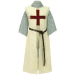 This heavy off-white, 100% cotton tunic is perfect for a Prince of the Holy Land. A blood red Crusader?s cross is sewn to the chest, while gold trim forms both an outline and sun rays in four directions. Matching lining. Dry clean only. S/M or L/XL.