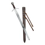 This Medieval Knightly Sword has a thick edged blade with a rounded tip built for stage and sport combat. The blade is forged from high carbon steel. The hilt is steel with a wooden grip which is bound in leather cord. A robust peen on the pommel ensures that the sword is durable is strongly constructed.