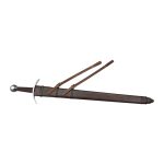 The scabbard is made from wood and it is wrapped in leather and fitted with a steel chape and brass buckles which can be used to adjust the height and angle of the two sword hangers with belt loops.