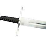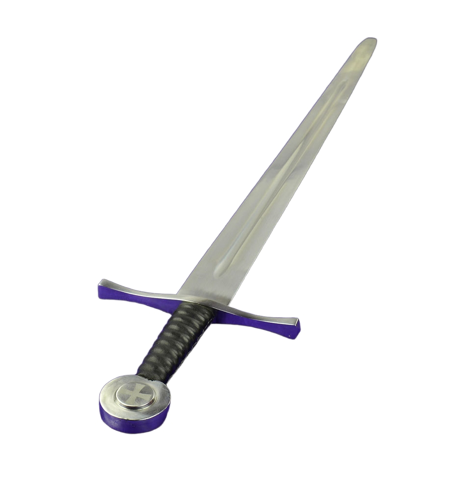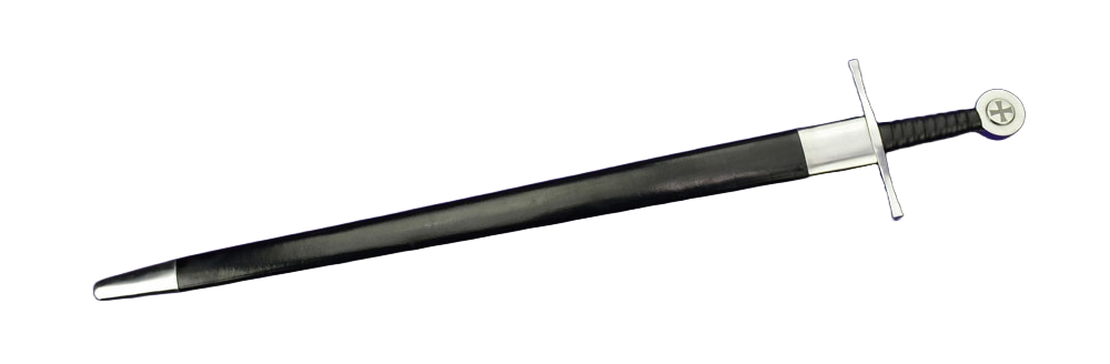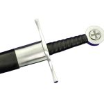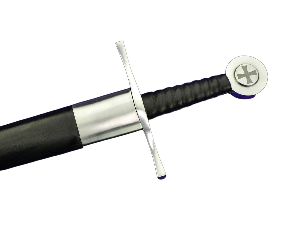 The crossguard and pommel are fashioned from solid steel, providing balance and protection to the wielder’s hand. The grip is crafted from wood and wrapped in stitched black leather, offering a comfortable and secure hold. Etched on both sides of the pommel is the distinctive Cross, a symbol closely associated with the Templar knights. This sword comes with a thick leather scabbard, reinforced with a steel locket and chape, designed to protect the blade when not in use and to add to the historical authenticity of the piece.