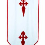 The Cross of Santiago, is the emblem of the military/monastic order of Santiago (Santiaguista) also known as Order of Saint James of Compostela. The origin of this order was in the kingdom of Leon Spain in the 12th century. Their name comes from the patron saint of Spain, James the Greater, under whom protection Galicians’ and Asturians’ Christians started to fight the Muslims in Spain in the 9th century. The Templar Knight Order of Saint James Banner by Marto of Toledo Spain features a white field with edging in red. In the field are 2 red Templar Santiago crosses. Cotton Banner with 2 Santiago cross embroidered on both sides. Cotton Banner with 2 embroidered Templar Santiago cross on both sides