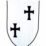 The Order of the Teutonic Knights of St. Mary’s Hospital in Jerusalem is a German Roman Catholic religious order. It was formed to aid Christians on their pilgrimages to the Holy Land and to establish hospitals to care for the sick and injured. Its members have commonly been known as the Teutonic Knights, since they also served as a crusading military order during the Middle Ages. The membership was always small and whenever the need arose, volunteers or mercenaries augmented the military forces. The Teutonic Order was founded by Emperor Henry VI as a hospital order in 1191, similar to the Templars and Hospitallers, in Acre, in the Levant, the medieval Order played an important role in Outremer, controlling the port tolls of Acre. By 1198, the German Teutonic Order became a religious military order of crusaders, first fighting in the Holy Land and later in Prussia and Lithuania. After Christian forces were defeated in the Middle East, the Order moved to Transylvania in 1211 to help defend Hungary against the Cumans. They were expelled in 1225 after allegedly attempting to place themselves under Papal instead of Hungarian sovereignty. In 1230, following the Golden Bull of Rimini, Grand Master Hermann von Salza and Duke Konrad I of Masovia launched the Prussian Crusade, a joint invasion of Prussia to Christianise the Baltic Old Prussians. The Order then created the independent Monastic State of the Teutonic Knights in the conquered territory, and subsequently conquered Courland, Livonia, and Estonia. The Kings of Poland accused the Order of holding lands rightfully theirs. The Order lost its main purpose in Europe with the Christianisation of Lithuania. The Order became involved in campaigns against its Christian neighbours, the Kingdom of Poland, the Grand Duchy of Lithuania, and the Novgorod Republic (after assimilating the Livonian Order). The Teutonic Knights had a strong economic base, hired mercenaries from throughout Europe to augment their feudal levies, and became a naval power in the Baltic Sea. In 1410, a Polish-Lithuanian army decisively defeated the Order and broke its military power at the Battle of Grunwald (Tannenberg). In 1515, Holy Roman Emperor Maximilian I made a marriage alliance with Sigismund I of Poland-Lithuania. Thereafter the Empire did not support the Order against Poland. In 1525, Grand Master Albert of Brandenburg resigned and converted to Lutheranism, becoming Duke of Prussia. Estonia and Livonia soon followed, and also the Order’s holdings in Protestant areas of Germany. The Order kept its considerable holdings in Catholic areas of Germany until 1809, when Napoleon Bonaparte ordered its dissolution and the Order lost its last secular holdings. Napoleon gave the order’s main assets to his allies of the Confederation of the Rhine The Order continued to exist as a charitable and ceremonial body. It was outlawed by Hitler in 1938, but re-established in 1945. Today it operates primarily with charitable aims in Central Europe. The Knights wore white surcoats with a black cross. A cross pattée was sometimes used as their coat of arms; this image was later used for military decoration and insignia by the Kingdom of Prussia and Germany as the Iron Cross. The motto of the Order was:”Helfen, Wehren, Heilen” (“Help, Defend, Heal”) The Templar Knight Teutonic Order Banner by Marto of Toledo Spain features a white field with edging in black. In the field are 2 black Templar Teutonic crosses. Cotton Banner with 2 Teutonic cross embroidered on one side. Cotton Banner with 2 embroidered Templar Teutonic cross on one side
