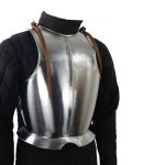 This breastplate is etched with the Templar Sigil and is crafted from 20 gauge steel. A set of crossing leather back straps and shoulder buckles fit and adjust the armor the the torso. The interior of the armor is blackened.