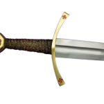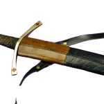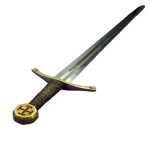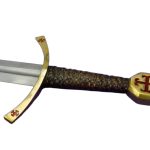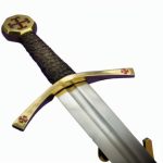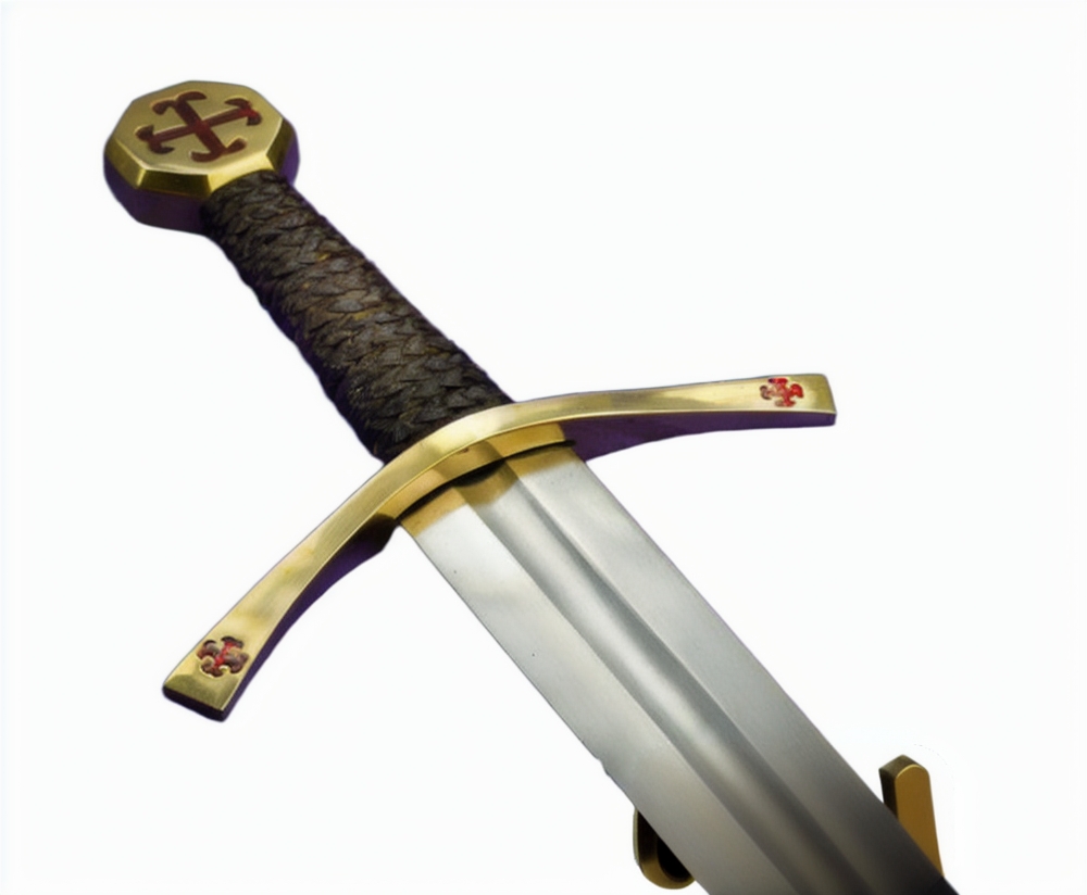 Hailing back to the order of the Templar Knights comes the Templar Sword. Based on historically authentic design, this piece features an unsharpened carbon steel blade with central fuller, a brown leather wrapped wood grip, and a brass guard with octagon pommel. An enameled red cross also accents the guard and pommel. A black and brown leather scabbard with belt accompany as well. Great for reenactments, costumes, and collections.