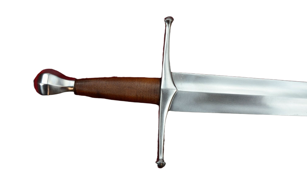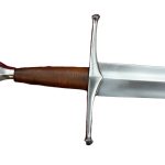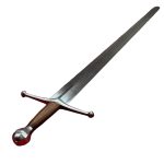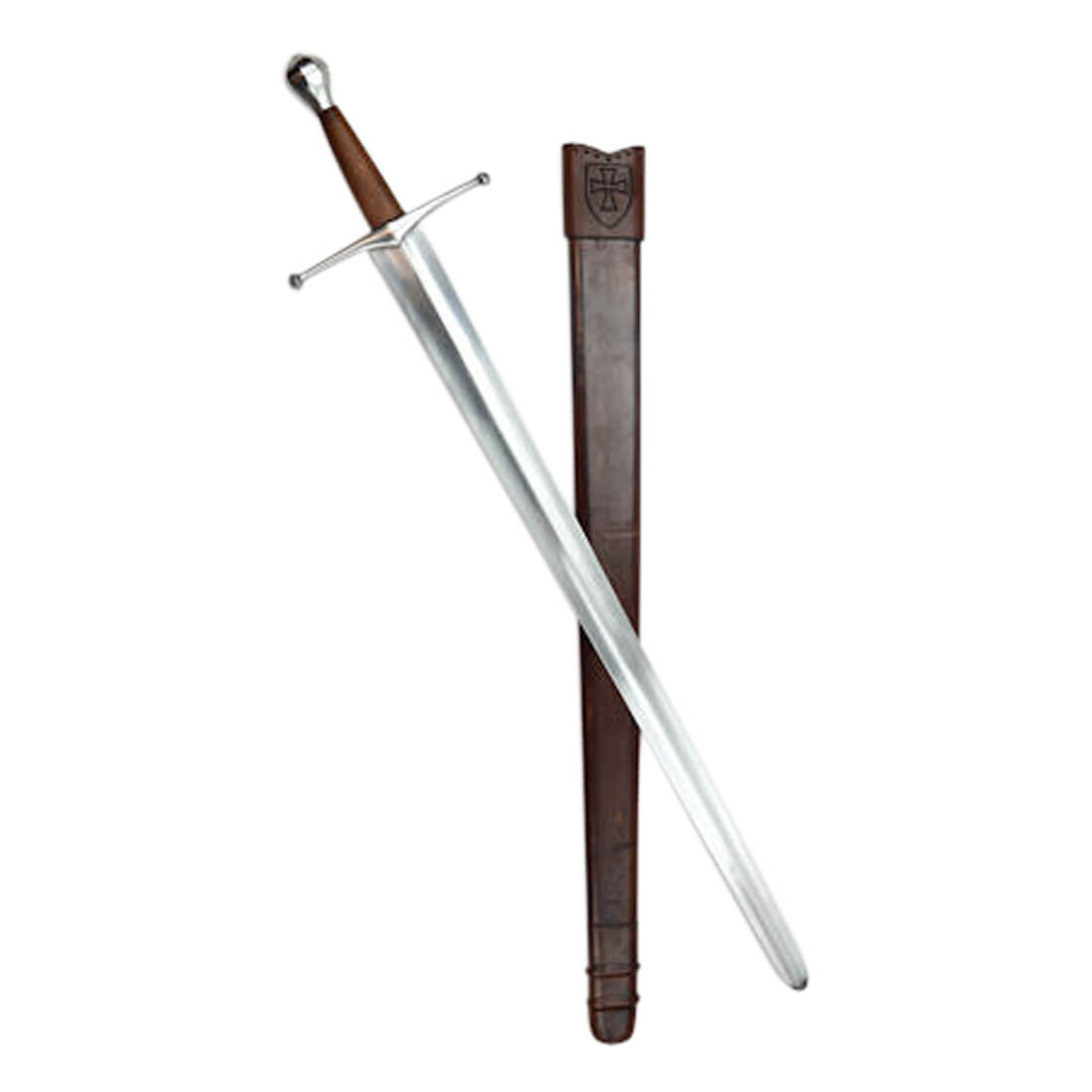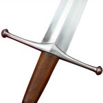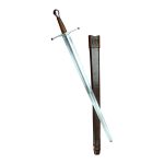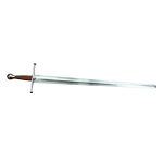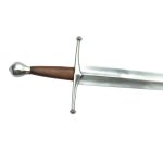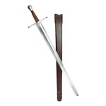 This Teutonic Arming Sword has a blade that is crafted from high carbon steel – it is built with a thick blade with blunted edges that are at least 2 mm thick that is intended for stage and sport combat. The tip is rounded for safety and blade has a hollow ground cross section to reduce unnecessary weight. The hilt is steel with a wooden grip that is overlaid in leather. The blade tang is solidly peened over the pommel to create a secure and strong hilt construction.