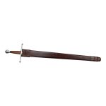 The wood-core scabbard is tightly wrapped in leather and is accented with an etched Cross and Shield sigil on a single side.