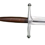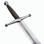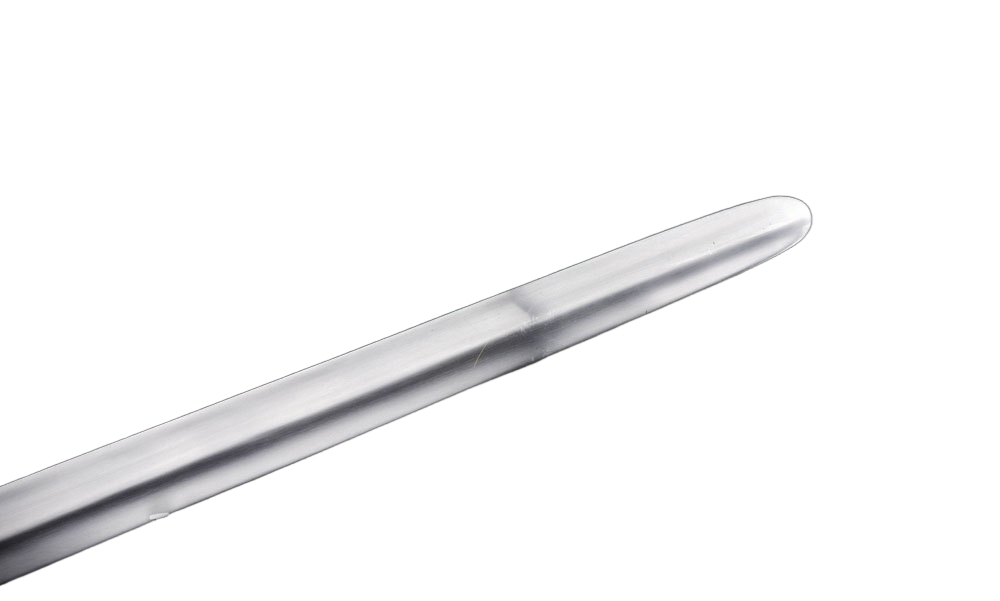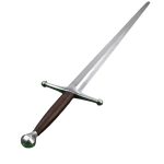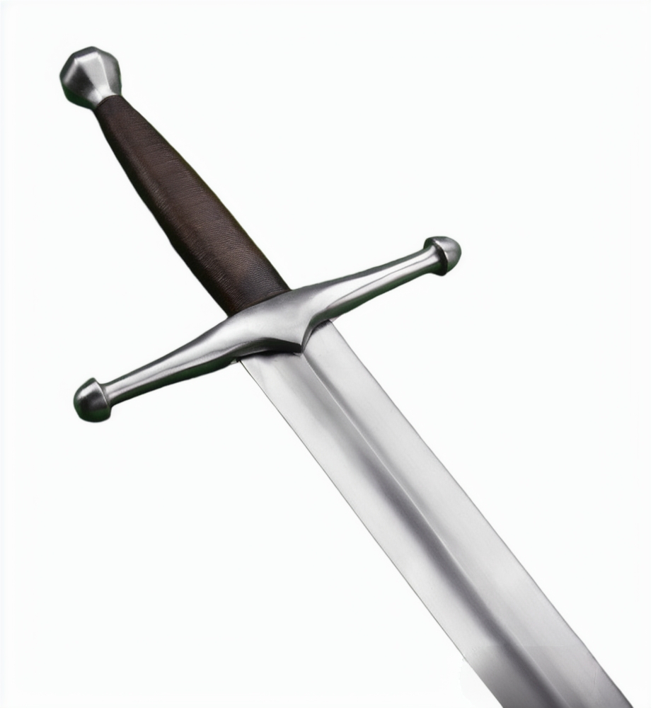 This German longsword has a thick blade with edges that are at least 2 mm thick to make it suitable for sport and stage combat. The blade is crafted from EN45 high carbon steel the crossguard and pommel are steel and the blade tang is peened over the pommel for a durable overall construction. The grip is wood overlaid in tight leather.