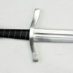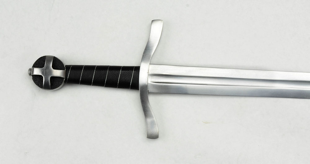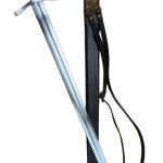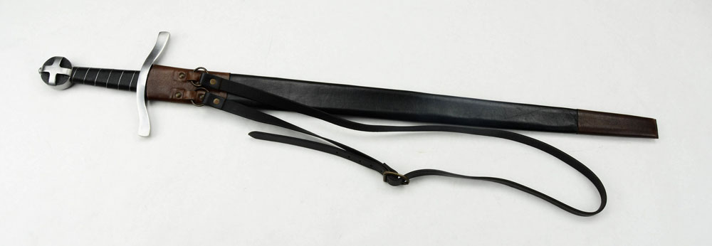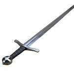 This Teutonic Arming Sword has blade of high carbon steel; the crossguard and pommel are steel and wooden grip is finished with a tight leather wrap and inlaid with twisted steel wire. Included is a durable leather scabbard with an integrated hanging baldric. The baldric has an antiqued brass buckle which allow its fit to be adjusted.