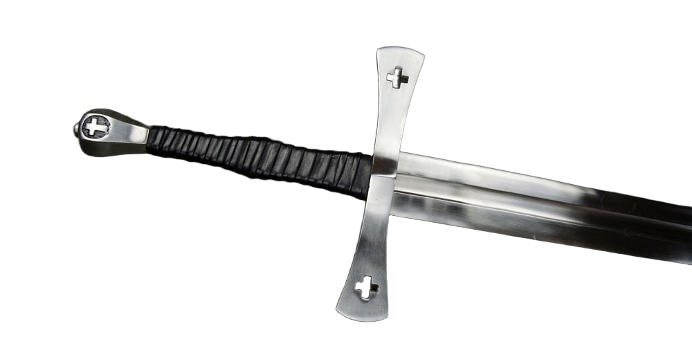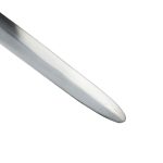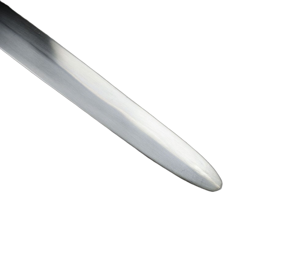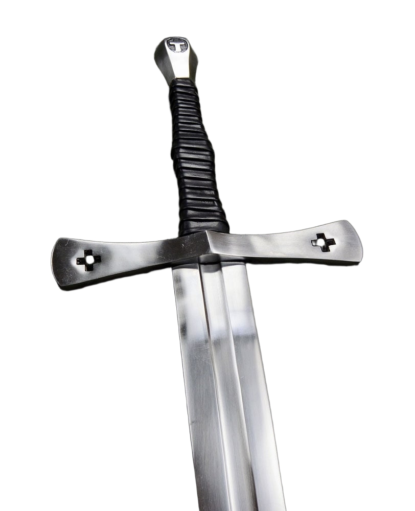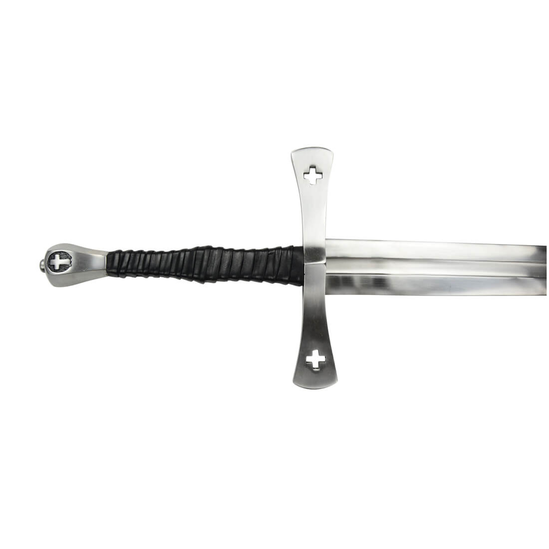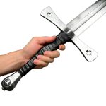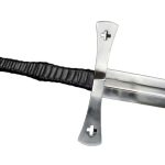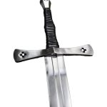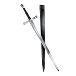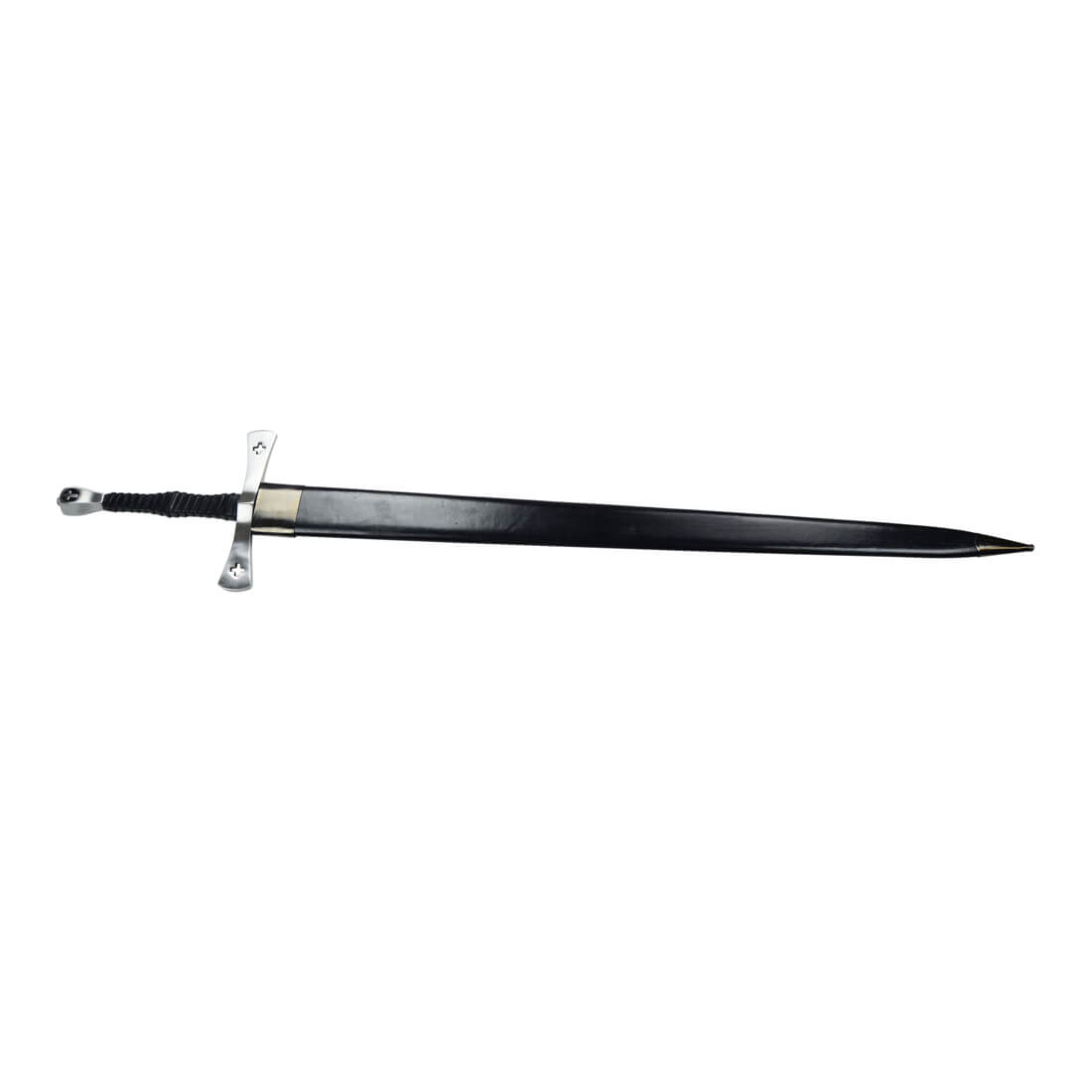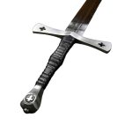 The Tewkesbury longsword is fitted with a blade of EN45 high carbon steel. The guard and pommel are mild steel and the grip is black leather wrapped over a core of wood. The scabbard is wood with black leather and darkened steel fittings.