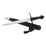 This popularity was surely affected when a sword that was discovered in the mid 20th century was identified by Ewart Oakeshott as the Sword of the Black Prince. Thought to have been stolen from Edward?s tomb centuries earlier, became one of the most recognizable artefacts of 14th Century Medieval swords. The sword has a long, tapered blade that is ideally suited for thrusting, while still remaining able to make powerful cuts. The handle is elongated to provide more leverage, which in combination with the large pommel results in excellent tip control. The original has a Type XVa blade, which is faithfully reproduced here. Edward?s “Black Prince” title may have come from his distinctive armor, which according to some sources was blackened steel (although the title may also have come from his temper, mercilessness to his enemies or derision towards the lower classes in spite of his chivalrous beliefs). The pommel and guard of this sword have been blackened to reflect that title, and would match the dark platted armor that Edward may have worn. A black leather wrapped handle and upgraded scabbard completes the look. This is the first time that DSA has interpreted this popular design, and would be suitable for anyone who has an interest in Medieval longswords in general or 14th Century interpretations specifically.