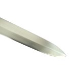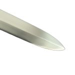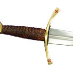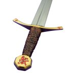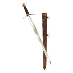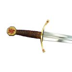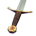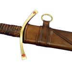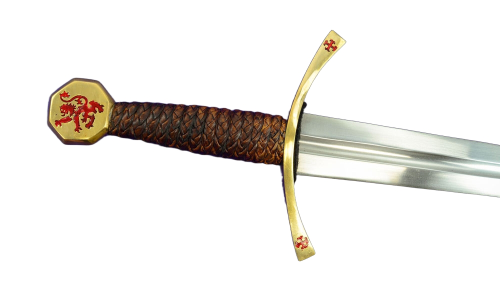 The Bruce Sword has a blade of high carbon steel and a hilt of brass with red enamel detail. The wooden grip is tightly wrapped in knotted leather. A felt tab is atop the guard to give it a cushioned fit against the scabbard it can be removed if desired. The wood core scabbard is wrapped and leather and has two brass hanging rings for wear.