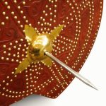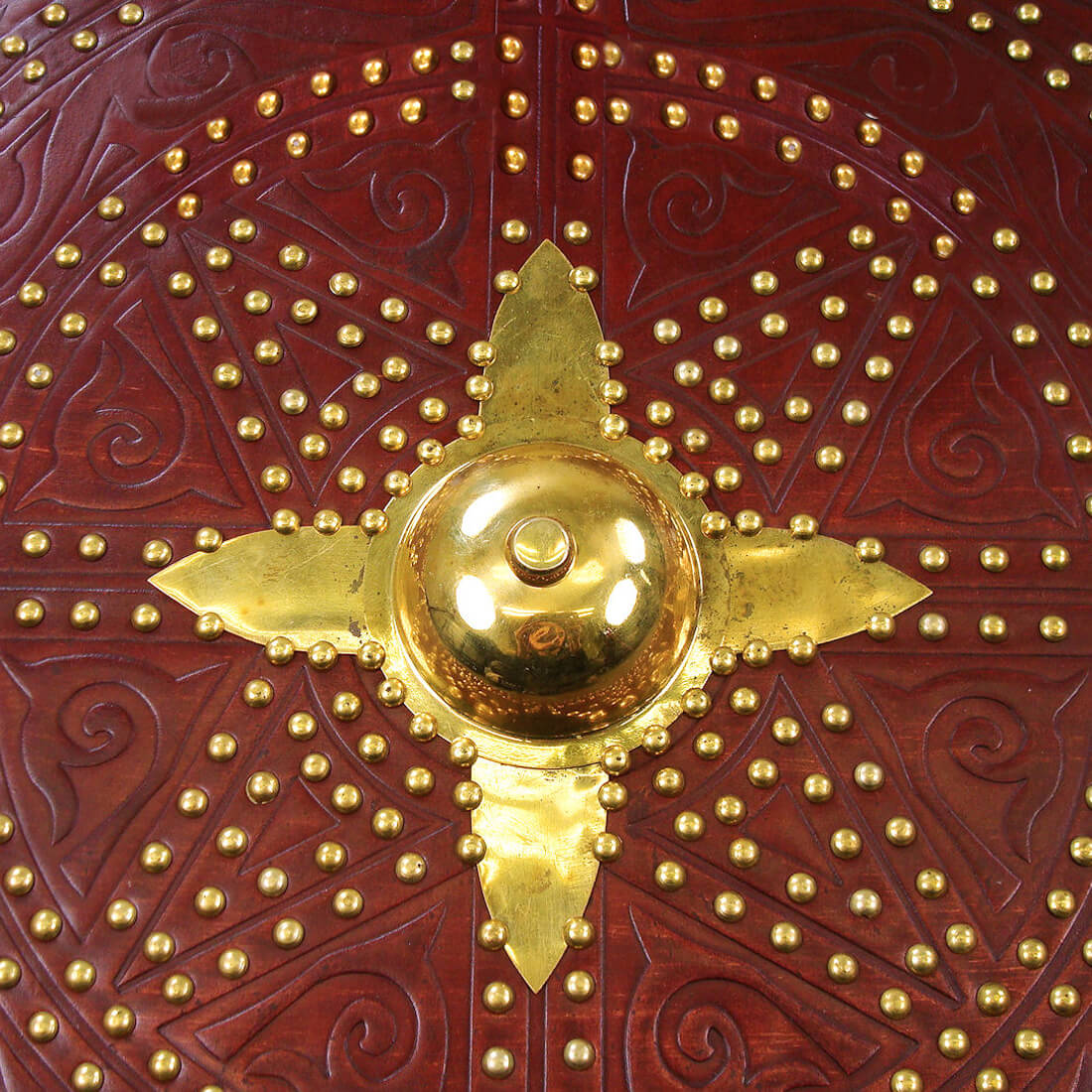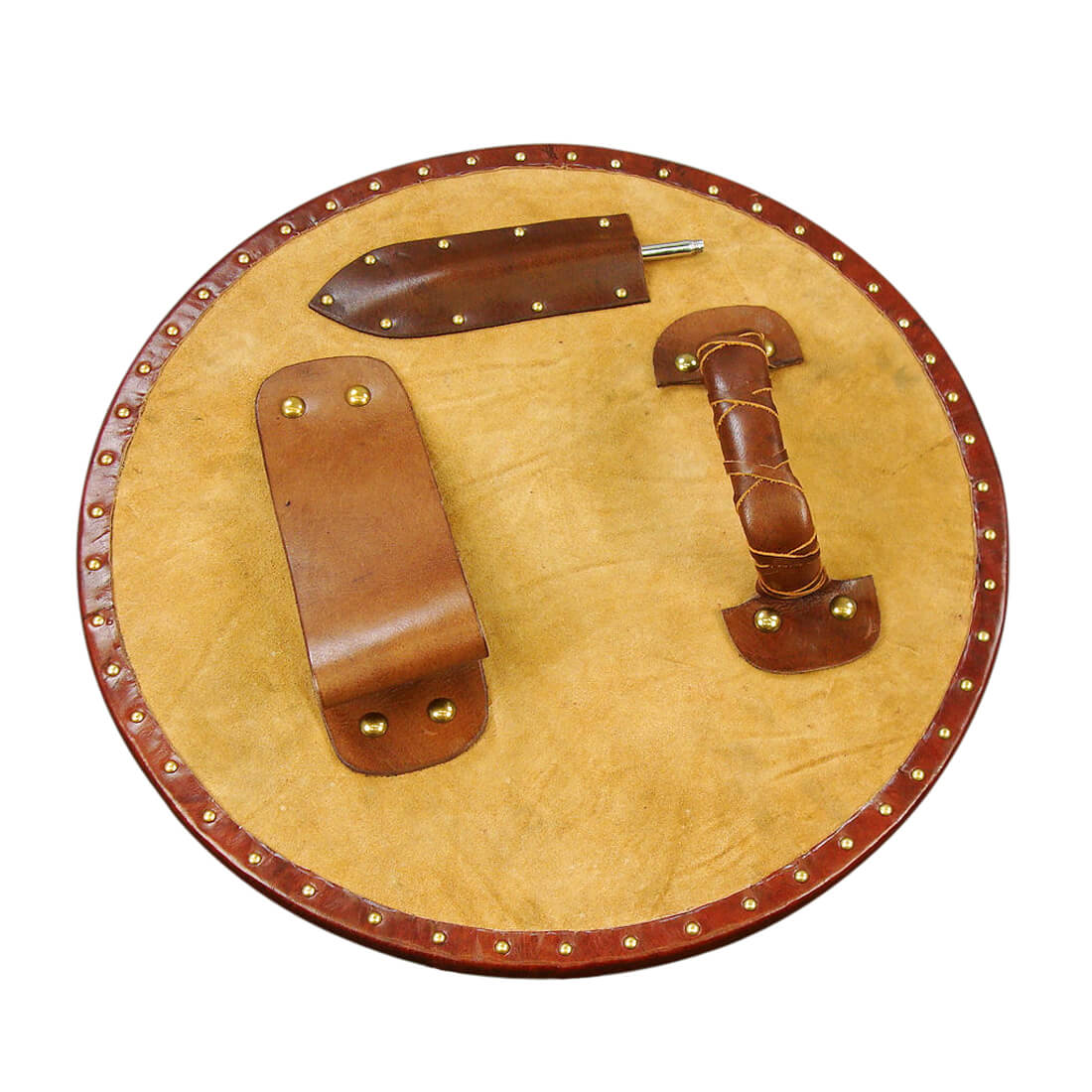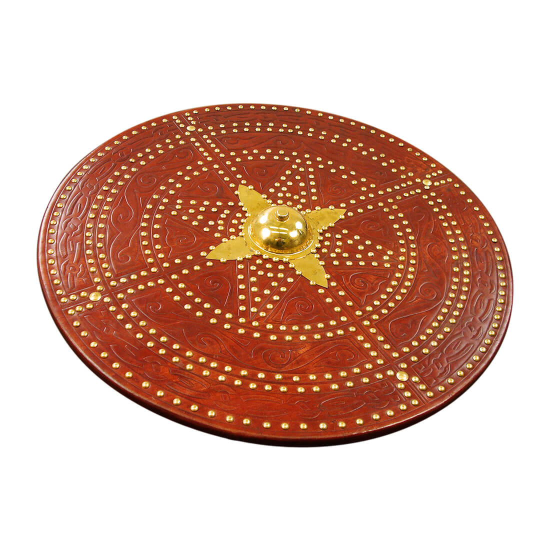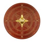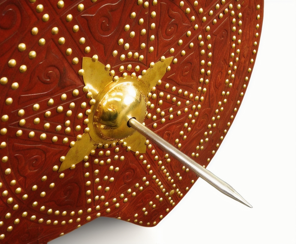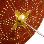 This Scottish Targe is crafted from wood and overlaid with leather with embossed Celtic design. Its shield boss and numerous studs are of brass. On its reverse it has a back that has been covered with suede leather, with an arm strap and grip of leather. It also has an integrated pocket for a steel spike that is 6 1/4?? long. The tip of the shield boss has a removable nut that can be replaced with this steel spike.