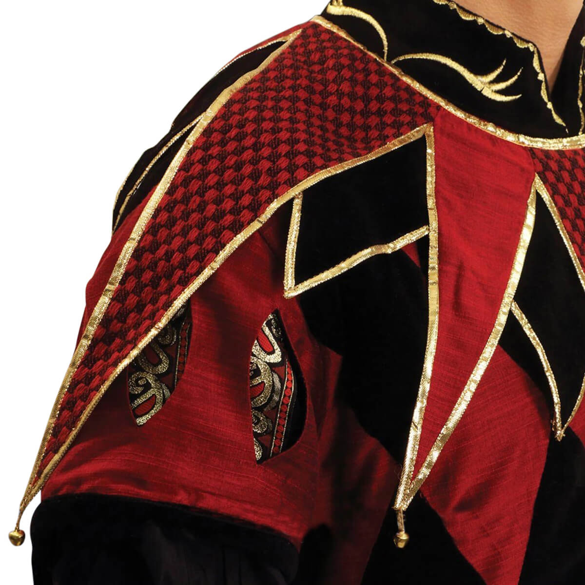 Our interpretation of this famous costume has much darker overtones. This three-piece ensemble includes the tunic, the collar and pants. The tunic has a dark red taffeta and black velvet harlequin pattern on the front with a solid black velvet back, along with lace-up sides. Features include a gold embroidered Mandarin color and velvet edged shoulder caps that have period slits, revealing a rich golden trim, with heavy-duty hook & eye closures runing down the front.