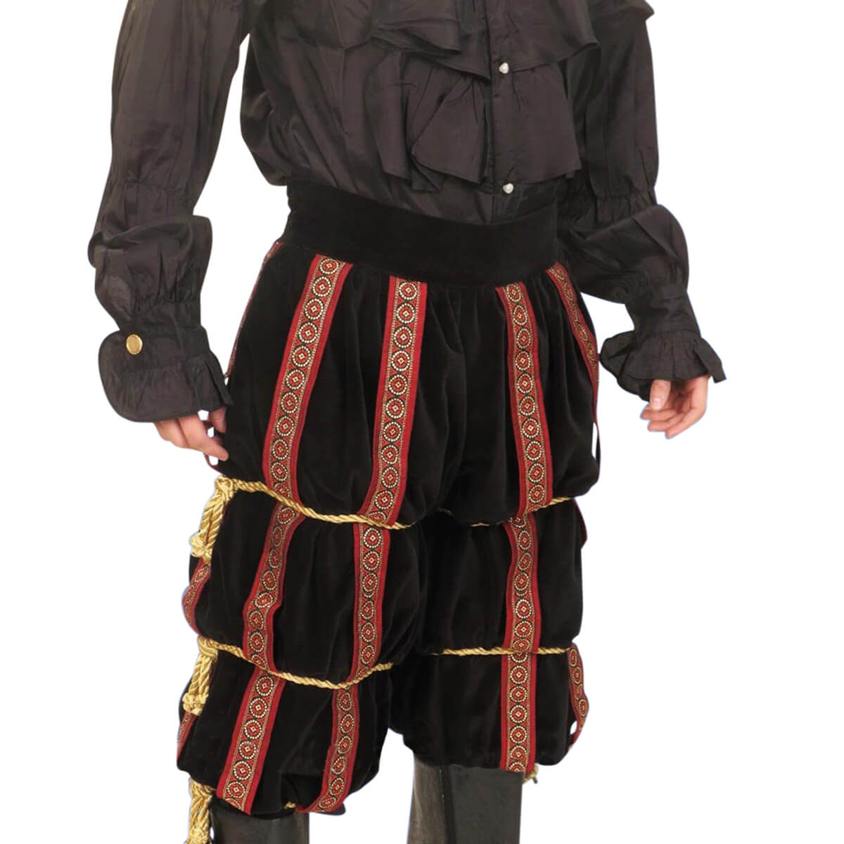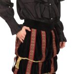 The sunray collar is made of matching taffeta and black velvet with 15 various sized points, each with a golden bell sewn to the end. The matching black velvet period knee breeches are of lined and sport a flat front with a generous elastic waistband in the rear and have hidden slit pockets. Stitched decorative ribbon bands adorn the pants along with golden roped garters. The wide bottom cuff has buttons for adjustability.