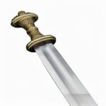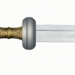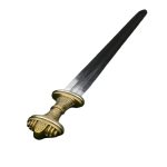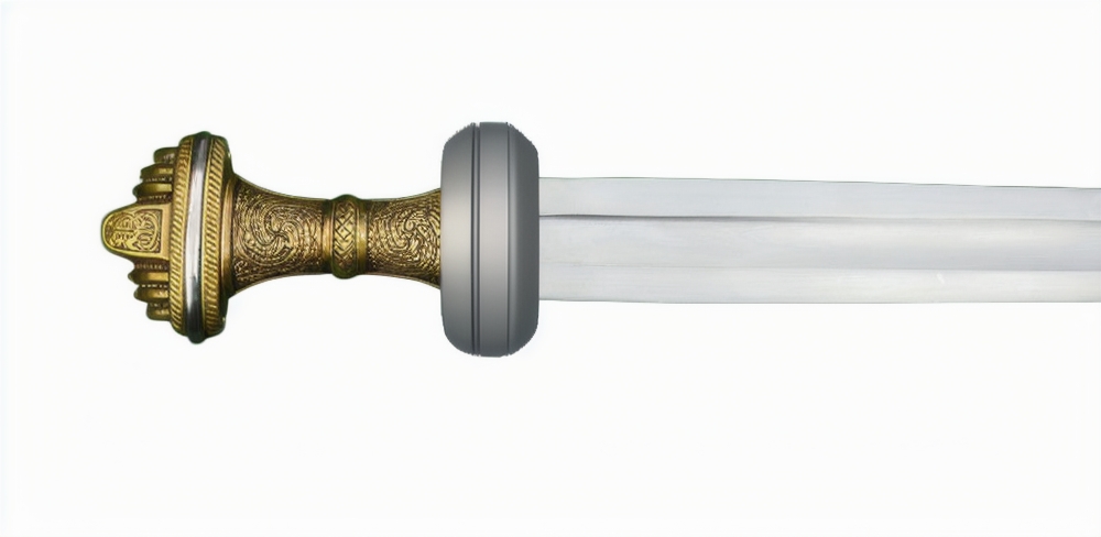This highly detailed sword recreates the fine swords available to champions, chieftains and kings of the late 8th Century and is closely based on the surviving components of the prized Fetter Lane sword which is part of the collection of the British Museum. The blade is tempered high carbon steel and the hilt is well-cast from brass and has an antiqued bronze finish; like the original it has different designs on either side of the hilt. Bands of nickel-plated steel adorn the guard and pommel to replicate tin – on original swords tin was valued as a decorative element because of its scarcity and likeness to silver in appearance. The composite pommel was riveted together in its final construction because original swords of this type had 2-part pommels which were completed by riveting a cap onto the pommel base.