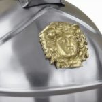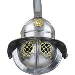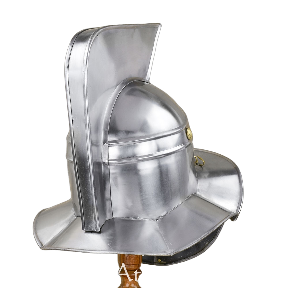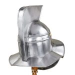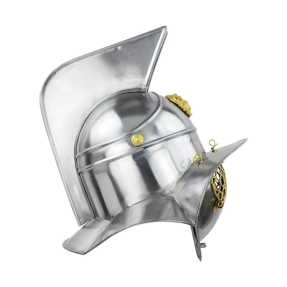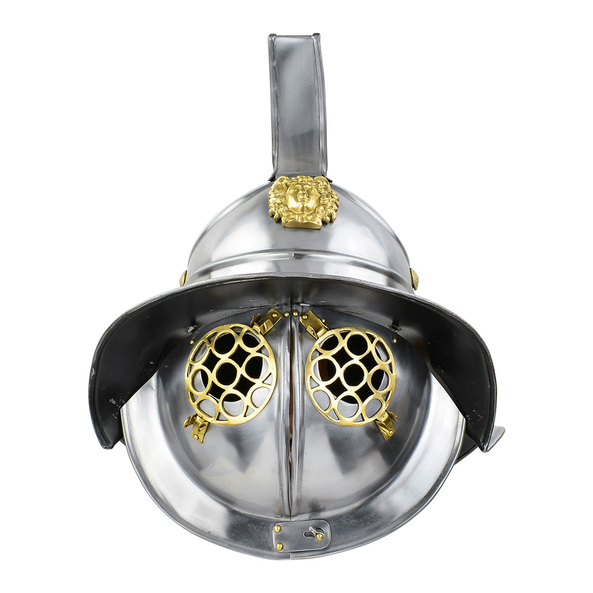 This Thracian helmet is closely designed to the Gladiator helmet. A metal “plume” and brass eye protector nets accent this helmet’s design. This Thracian Gladiator Helmet is constructed from 18 gauge steel with well cast brass accents. The protective mask is secured with brass pins and can be removed. A hinge on the two-part mask keeps it closed.
