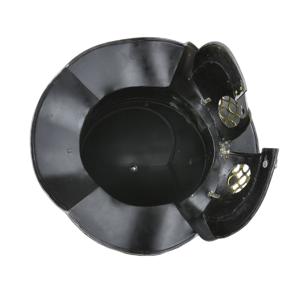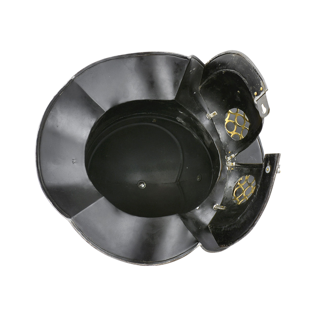 The blackened interior of the helmet is unlined. Included is a cotton padded arming cap.