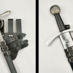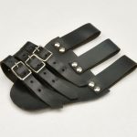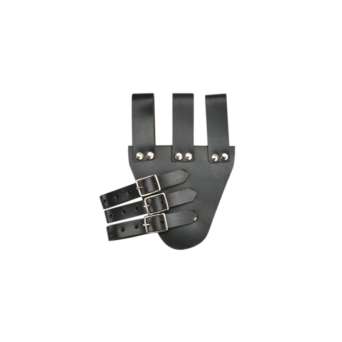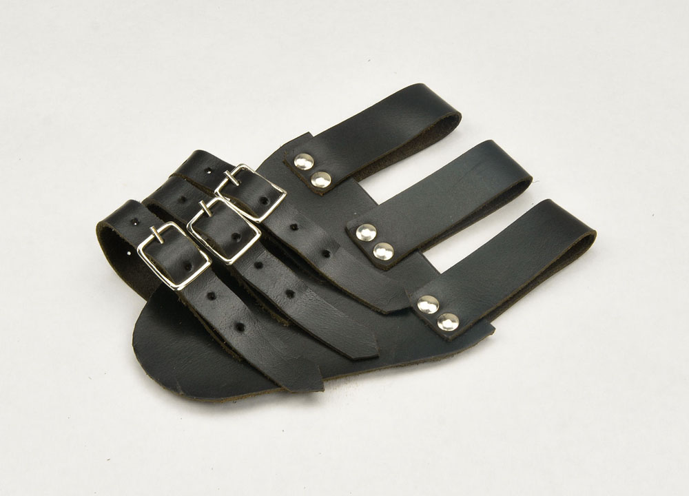 This sword frog is constructed from sturdy, riveted leather. It is fitted with three adjustable buckled straps to hold the scabbard of your rapier and hang it at an angle from your sword belt.
