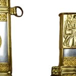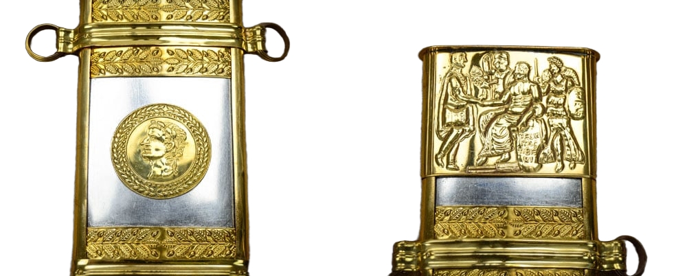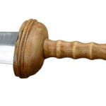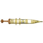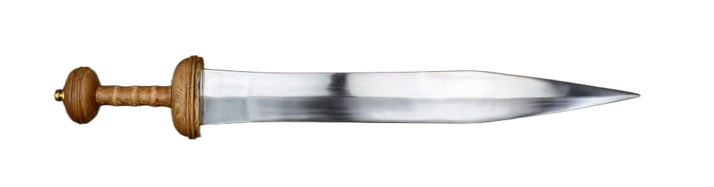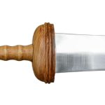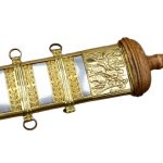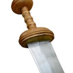 The Tiberius Gladius has a blade of high carbon steel and a hilt of wood. The guard plate and pommel nut are brass. The scabbard is wood with steel and leather – it is finished with brass accents.