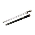 While not a direct copy of any particular sword, the Viking sword design was inspired by historical examples from the early 9th Century, most notably finds from the area around Trondheim, Norway, where the circular indentation hilt decoration was popular.The scabbards are provided with suspension points and a period chape, giving the sheathed sword a very attractive appearance. The construction of the Viking “pair” differs from other swords in the Tinker series inasmuch as they are tang-riveted (peened) in period fashion at the pommel, primarily to satisfy Viking re-enactment requirements, and the blunt blade design is very much directed towards re-enactment rather than sparring. However, as with the other swords in the series, replacement blades are available and Tinker is offering a blade-replacement and re-peening service for users unable to undertake the task themselves.See models SH2408 for the Tinker Sharp Viking Sword and SH2420 for the Blunt replacement blade.