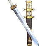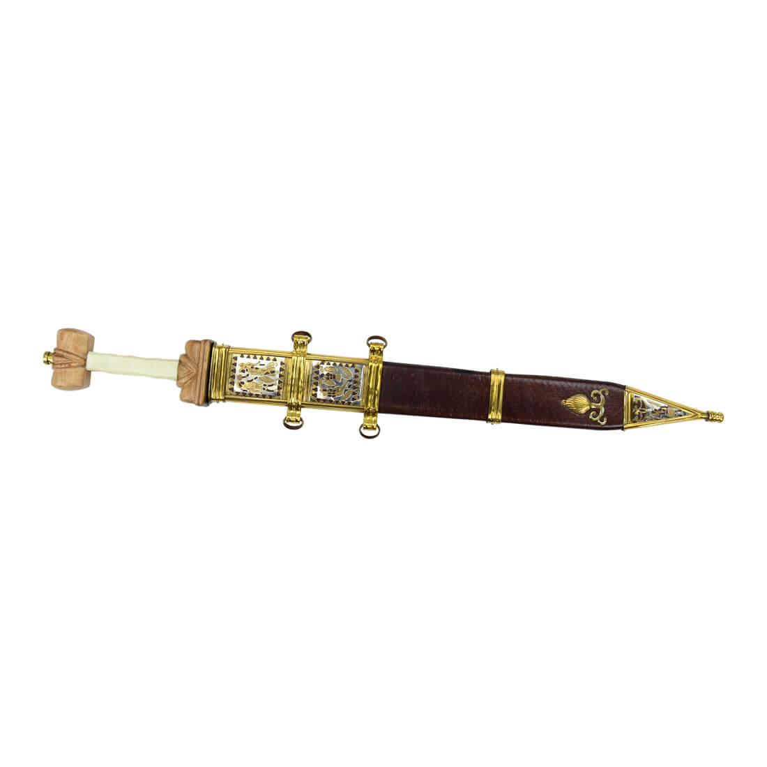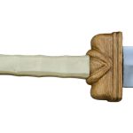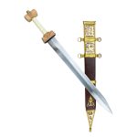 The Roman Titus Vespasianus Gladius has a blade crafted from high carbon steel and a hilt of wood with a grip of bone. The guard plate and pommel nut are brass and a removable felt washer protects the guard plate from scratching or scuffing from contact with the scabbard.