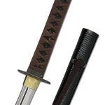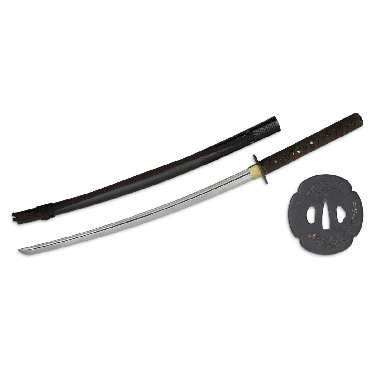 The Tori Iaito features truly elegant furniture for the discerning Iaido practitioner. It features a Flying Crane themed Tsuba and Fuchi/Kashira with Kabuto inspired Menuki. The high quality brown leather Tsuka-ito is wrapped over black Same. The Saya is wrapped at the mouth with black-lacquered rattan and finished in a textured brown.