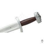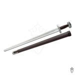 Our Tourney Series Sparring and Stage Swords from Kingston Arms will set a new standard in this price point of re-enactment weaponry. Features like thru-tang handle construction, peened stainless steel pommel and guard, 2mm rounded edge thickness make these two brutal weapons on the battle field. The cord wrapped leather grip feels exceptional in the hand with an oval cross section and slight barrel shape to keep fatigue at bay. The grip is large enough to accomodate armoured hands. A respectable fuller runs the length of both pieces to lighten and counter balance the swords overall. A wood core and leather wrapped scabbard tipped with a stainless chape comes with each sword. The first Tourney Series models are the Viking Sword and Single-hand Swords with others coming soon.