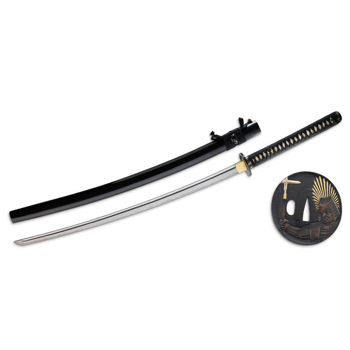 Hanwei has created a genuine piece of sword art with the Toyotomi Hideyoshi Katana. The tsuba depicts the image of Hideyoshi embossed with gold detailing and an etching of Osaka castle on the opposite side. The fuchi illustrates the tea ceremony with gold detailing and as well as kashira with its depiction of Osaka castle. The handle is wrapped in black cotton over white same. The 27″ forged blade features a hi on both sides to make this a light and quick katana. The deep black lacquered saya completes the piece. The Toyotomi Hideyoshi Katana represents the best of Hanwei craftsmanship and sword art which will satisfy the practitioner and the collector alike.