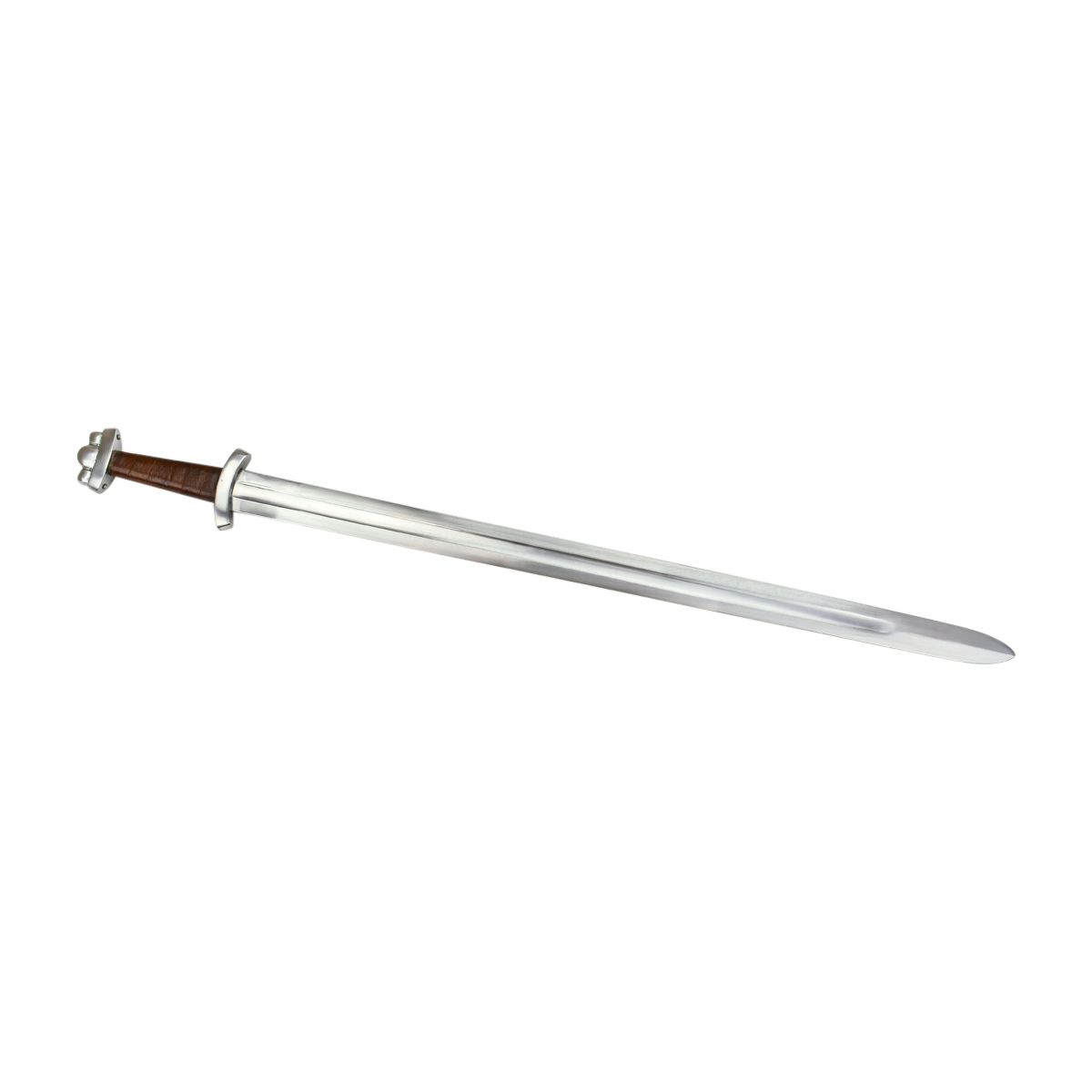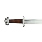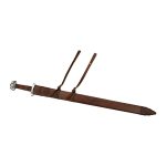 The Triple Lobed Godfred Sword is named after the famed Viking raider whose legacy continues to live on. This Viking Sword is built for the rigors and blade-on-blade contact of stage and sport combat with its thickened blade and durable hilt construction. The blade is high carbon steel and the hilt is steel with a hardwood grip which is overlaid in tight leather. The wood core scabbard is wrapped in tight leather and has two adjustable buckles and belt loop leather straps which allow for the sword to be fitted onto a belt and then adjusted for height and angle.