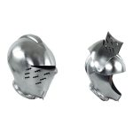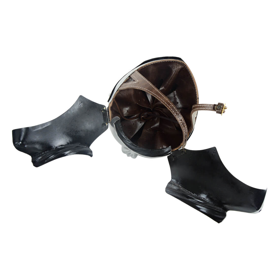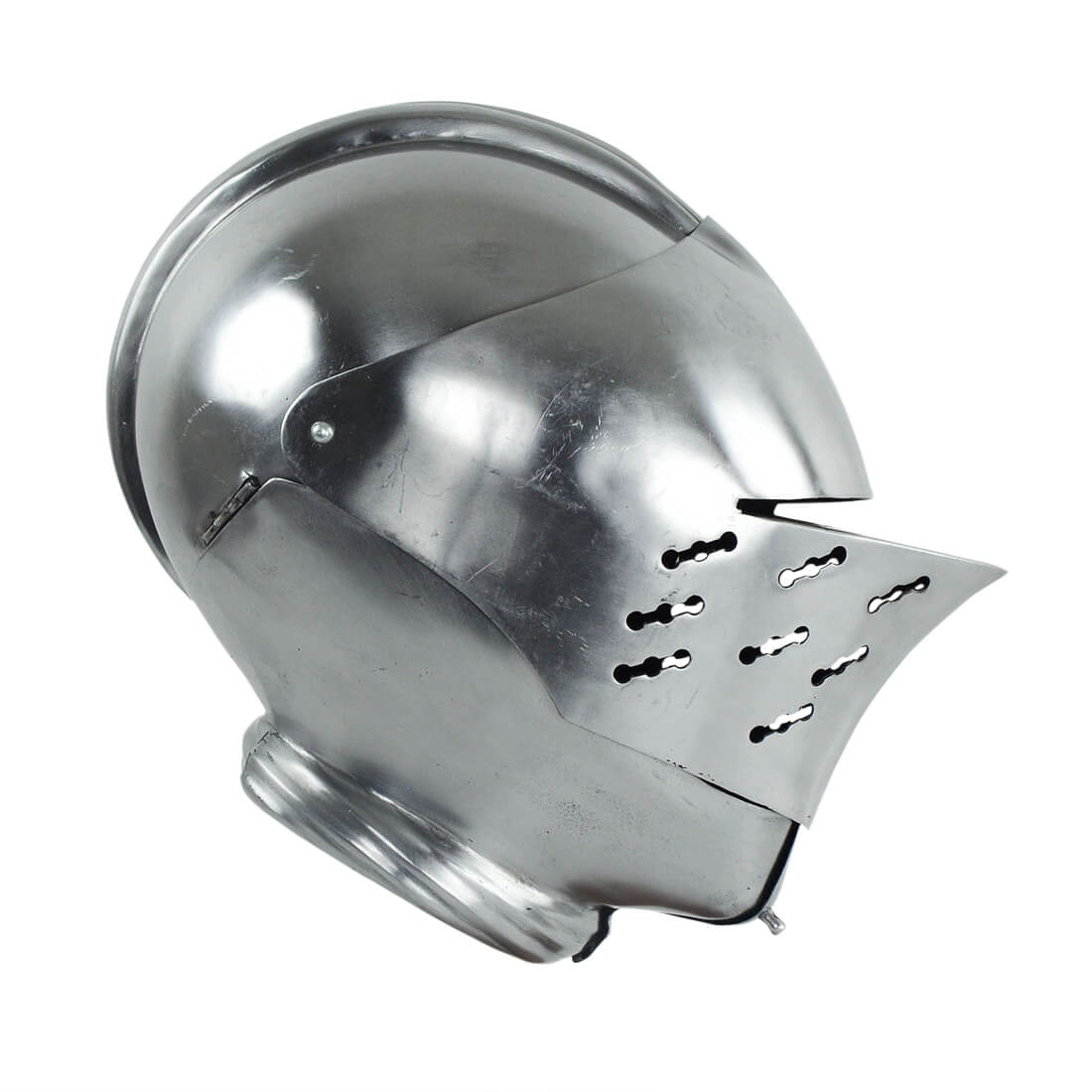 The Tudor Armet Helm is constructed from 18 gauge steel and has a well-articulated visor and side plates that open to allow for them to be fitted around the head. A long pin secures these side plates closed when they are placed onto it.