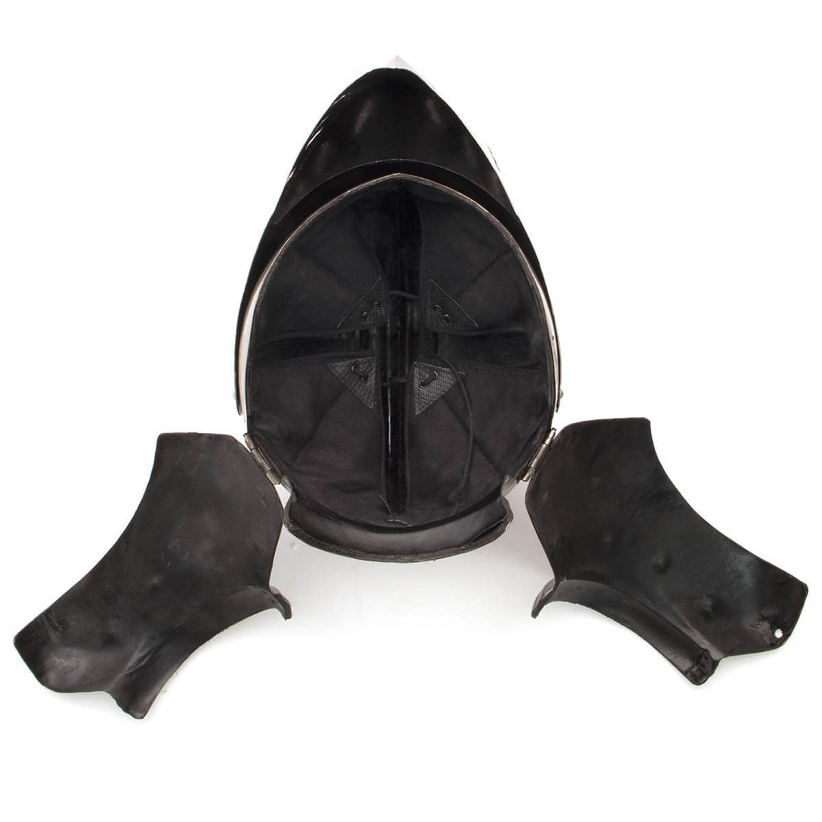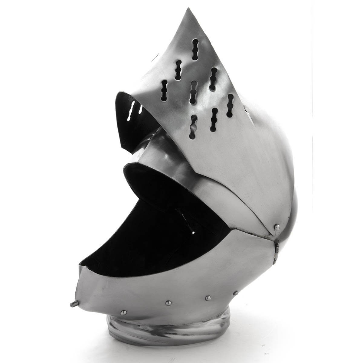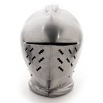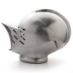 Of all the historical helmets, the armet has been portrayed in literature and film more than any other. This classic knight’s helmet is fully wearable but perfect for display. Hand-forged from 18 gauge steel, the visor lifts, and the chin plates are hinged to open for putting it on and removing it. Popular throughout Europe from the mid-15th century to the end of the 16th. Adjustable cotton canvas liner. Fits up to a 15-1/2″ neck size. Made by Noble Armoury.