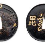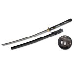 Continuing our series, this beautiful katana features the embossed likeness of Uesugi Kenshin replicated from Japanese artwork. The 27 1/4″ forged T10 steel blade cuts as well as it looks. The fuchi and kashira are blackened with gold detailing. The gold dragon menuki are over laid with a black cotton handle wrap over real ray skin. The matte black textured painted saya completes the piece with a subdued and humble finish.