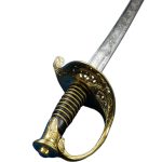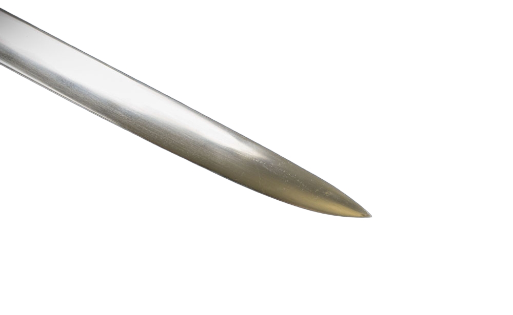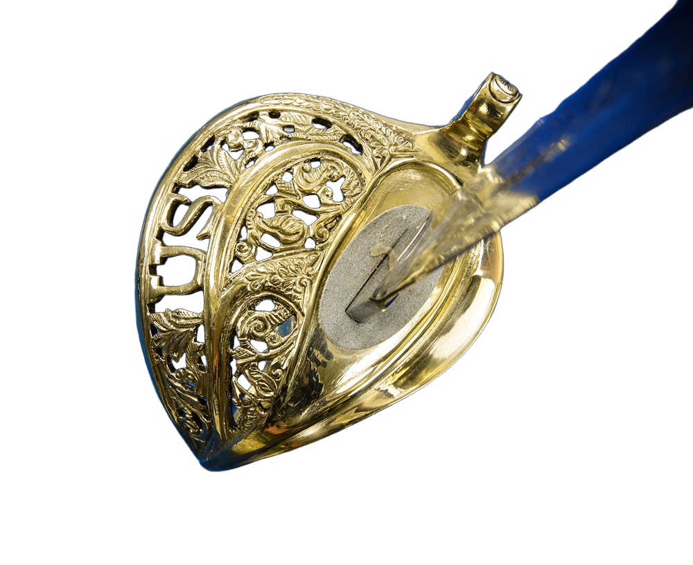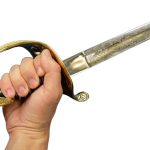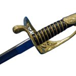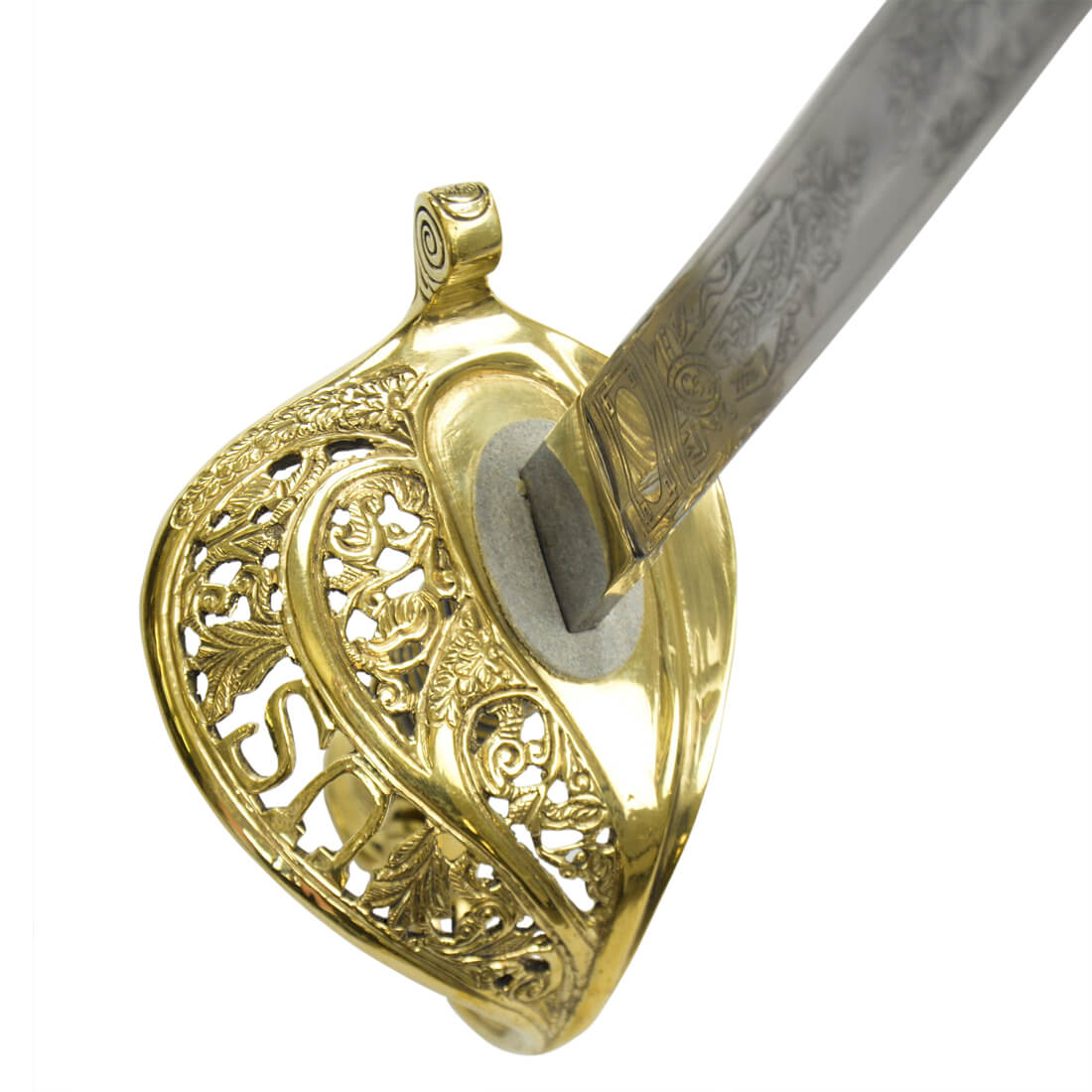 The 1850 Union Staff and Field Officer sword is fitted with a blade crafted from 1055 high carbon steel. The blade is lavishly embossed on both sides with military regalia. The hilt is of brass and the grip is overlaid in leather and wrapped in twisted bands of brass.
