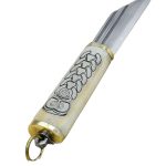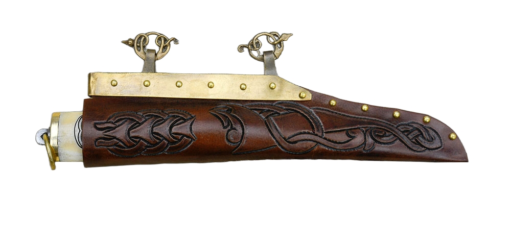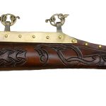 This Viking Seax has a blade hand-forged from high carbon steel and a grip which is hand-carved from bone which was polished and etch with Viking Norse design. The bolster and pommel plate are brass and a seax is completed with a brass ring for a lanyard. Included is a tough sheath crafted from high quality vegetable tanned leather which was embellished with hand-set Viking design tooled into the leather before finishing it with a deep and earthy brown stain. The sheath is completed with brass fittings and brass hanging rings which are cast into the form of entwined Norse serpents.