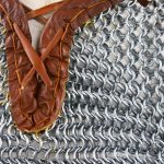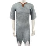 This Viking style half-sleeve hauberk is constructed from zinc-plated mild steel rings with butted construction. Zinc plated rings are resistant to rust and make this armor easier to maintain. It will also require less oiling than standard steel which makes it both easier to care and less messy to use. Leather edging and lacing in the back allows its fit to be tightened and adjusted after donning. Measurements are approximations length denotes the distance from top of shoulder to bottom.