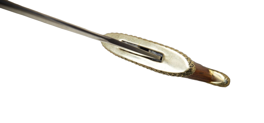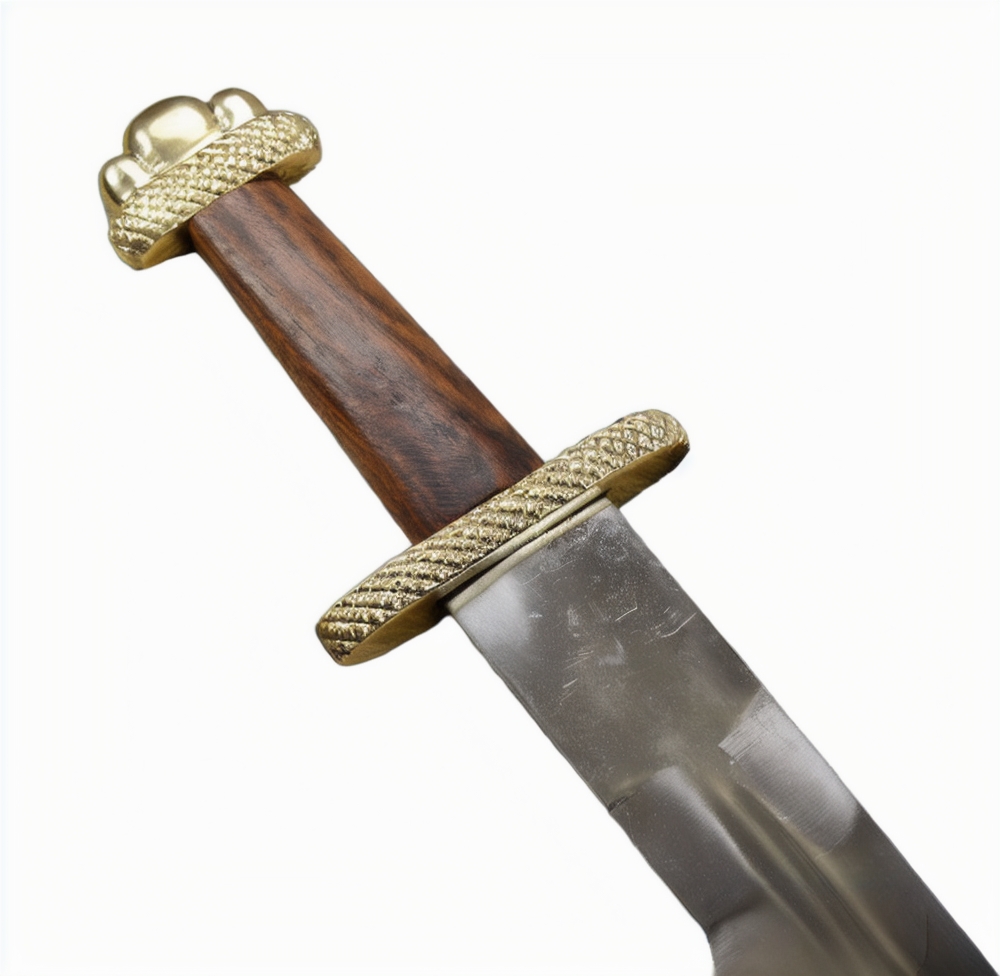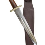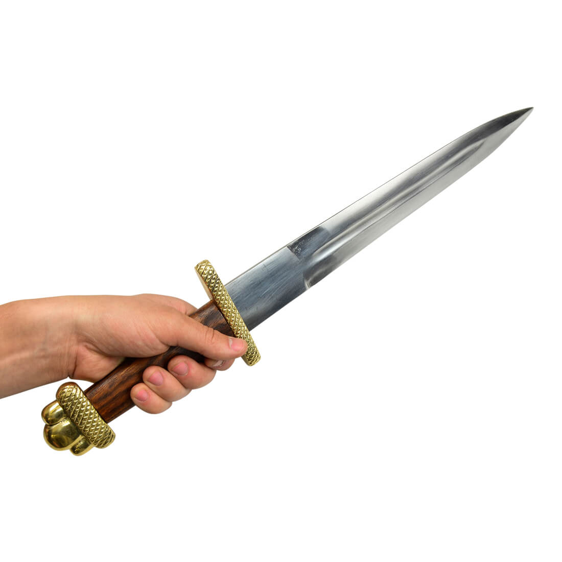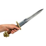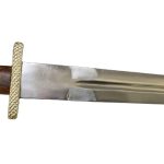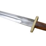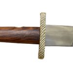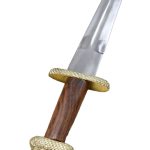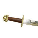This large Viking Dagger is fitted with an unsharpened blade of high carbon steel. The crossguard and pommel of the hilt are brass and the grip is wood.