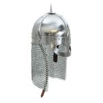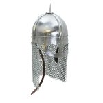 This Viking Gjermundbu helm is crafted from riveted 18 gauge steel plates; the aventail is butted steel chainmail. The helm is fully lined with leather and even the ocular plate has a backing of leather. The helm has an adjustable leather suspension liner and an adjustable chin strap of leather with a brass buckle.