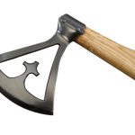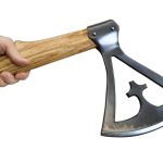 This Viking cross axe features a blackened steel head, unsharpened, mounted on a sturdy, polished hardwood haft, blending functionality with the warrior spirit of the Norse.