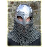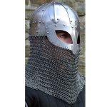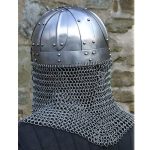 The Viking Helmet Battle Armor 18G Steel and Chainmail is a unique piece of head gear that pays homage to history’s favorite and fiercest Norse scavengers. Featuring layered 18 gauge steel construction, this handsome head gear comes with a bascinet style visor which guards the face and a double ring of steel chainmail links circle the bottom edge. The interior has a lacquered finish and ensures a comfortable and secure fit with a leather suspension liner and adjustable chin straps. With superior strength and protection, this helmet is perfect for costumes, collections, and re-enactments.