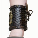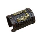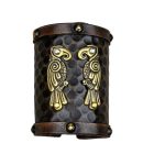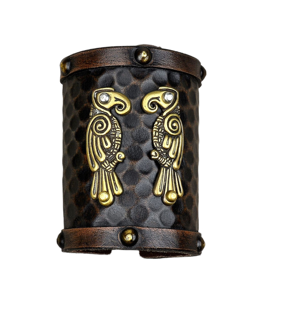 Made from thick and high quality vegetable-tanned leather, this wrist cuff is emblazoned with the twin Ravens of Odin which are cast from finely detailed antiqued brass. Antiqued brass studding and eyelets complete this wrist cuff and included is a leather cord to lace and attach it to the wrist. The inside of the cuff is lined with suede leather for comfort.