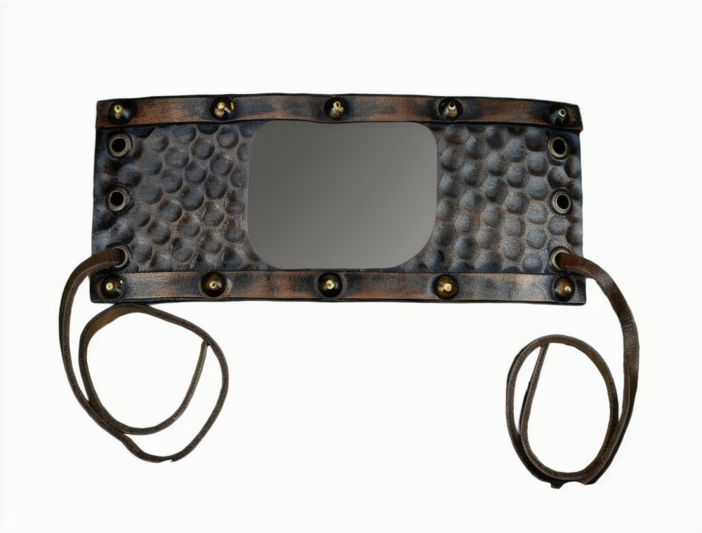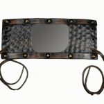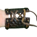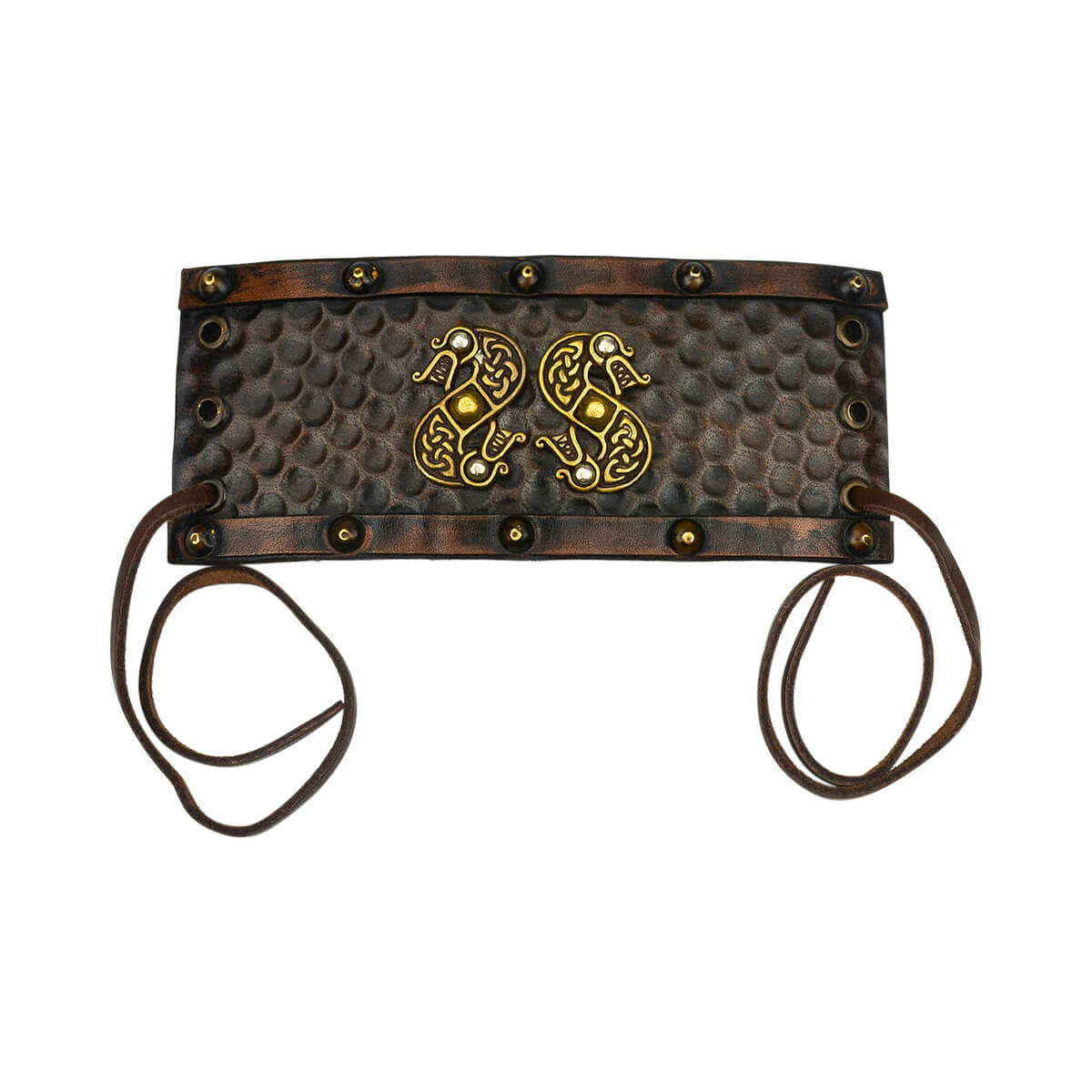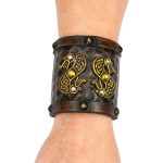 Made from thick and high quality vegetable-tanned leather, this wrist cuff is emblazoned with twin Norse serpents which are cast from finely detailed antiqued brass. Antiqued brass studding and eyelets complete this wrist cuff and included is a leather cord to lace and attach it to the wrist. The inside of the cuff is lined with suede leather for comfort.