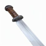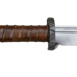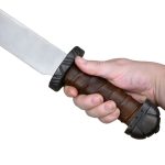 Built for stage and sport combat this Viking seax has a thick-edged blade of tempered high carbon steel which is durably mounted and peened for an overall robust construction. The guard and pommel are crafted from heat-blued steel and the hardwood grip is bound in tight high quality leather. The sheath is made from thick quality leather and it is constructed with sturdy leather cord stitching and integrated belt loops to allow it to be worn on a belt.