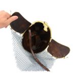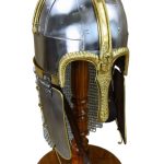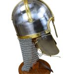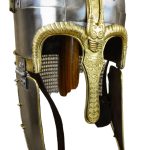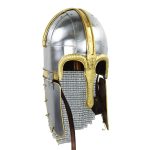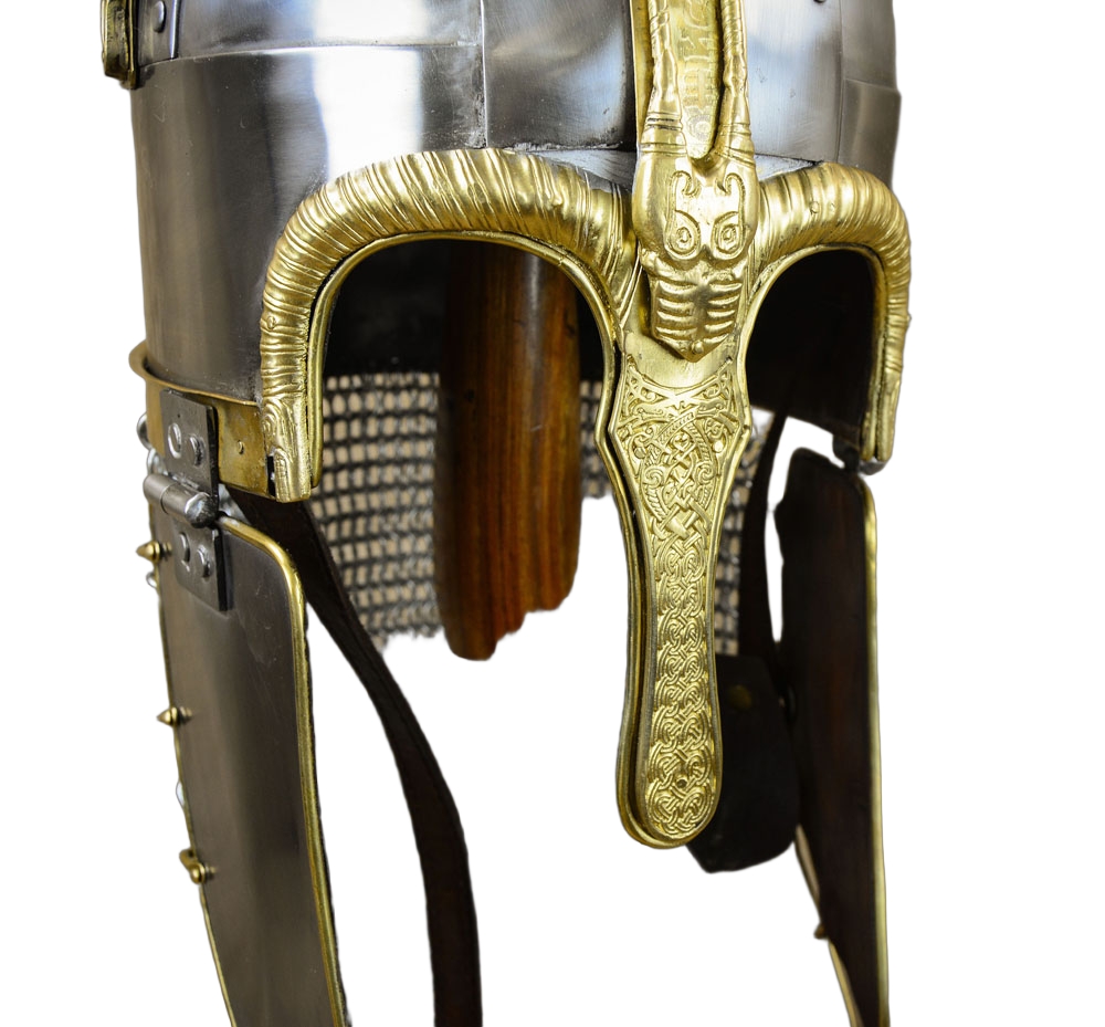 This reproduction of the Anglo Saxon Coppergate helm is constructed from plates of riveted steel and brass fittings. The entire interior of the helm is lined with leather and is finished with an adjustable leather suspension liner and an adjustable chin strap with antiqued brass buckle. The aventail is of butted mail.