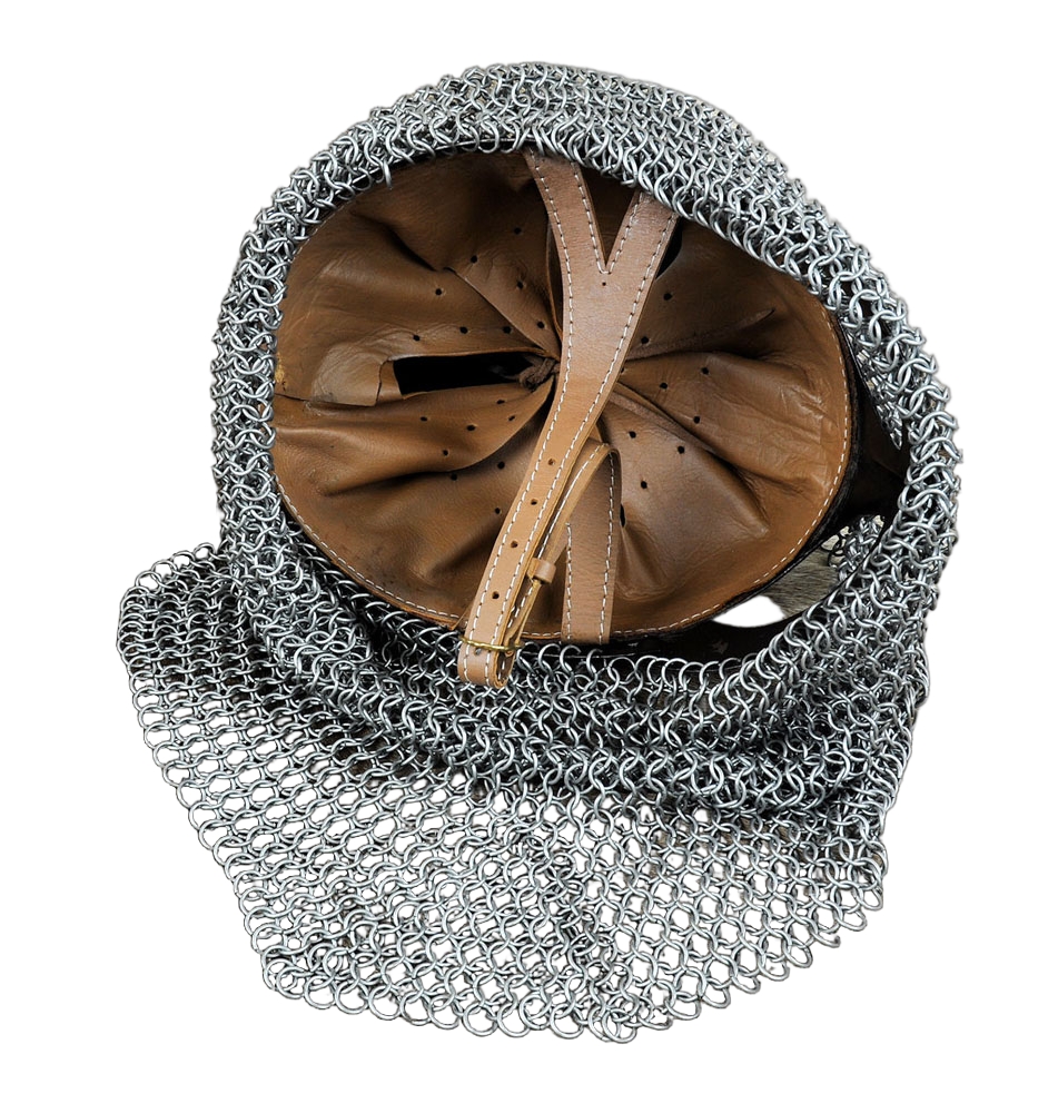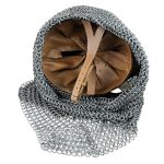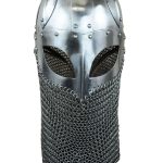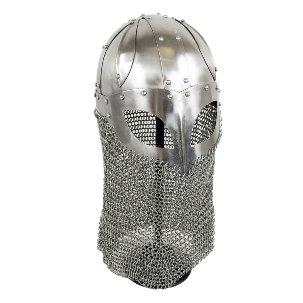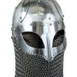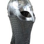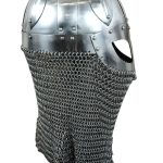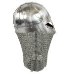 If you are a Viking enthusiast, you’ll love the Viking Ocular Helm with Chainmail Camail. This head gear is modeled after the spangenhelm style which has a conical design that curves with the shape of the head and meets at a point with a framework of metal strips. Featuring riveted 16 gauge steel plates, this piece has a blackened interior with an adjustable leather suspension liner and an adjustable chin strap with brass buckle to ensure a secure fit. Enhanced protection is provided with the inclusion of a butted, mild steel chainmail camail. With an authentic appearance, this helmet is great for costumes, re-enactments, and display.