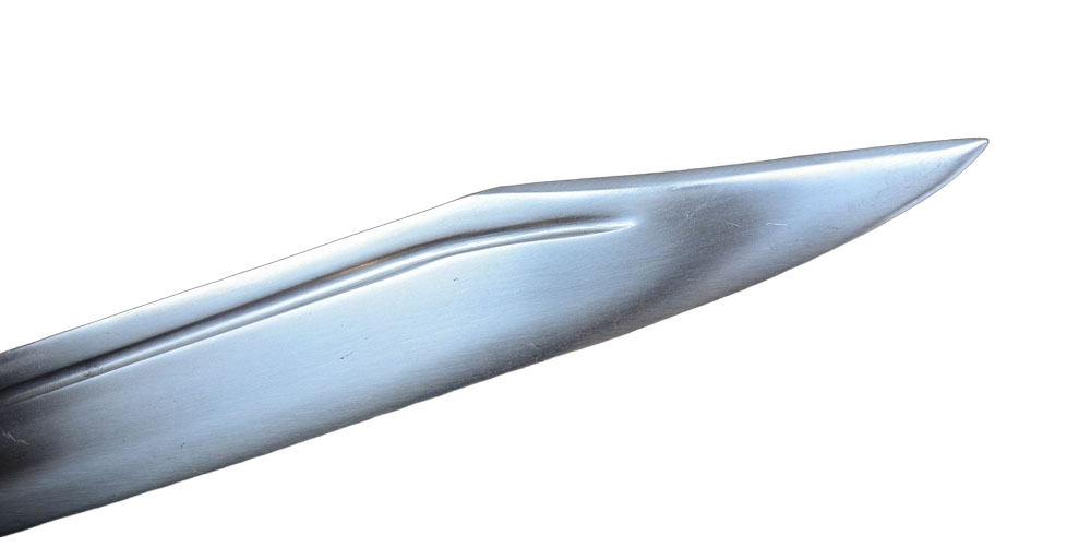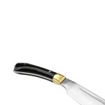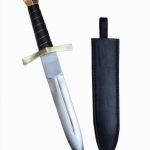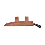 This large Viking Seax has a hilt of carved bone that is riveted to the thick, full tang. The blade is crafted from EN45 high carbon steel. The bolster is brass and the included sheath is constructed from thick, stitched leather with integrated belt loops.