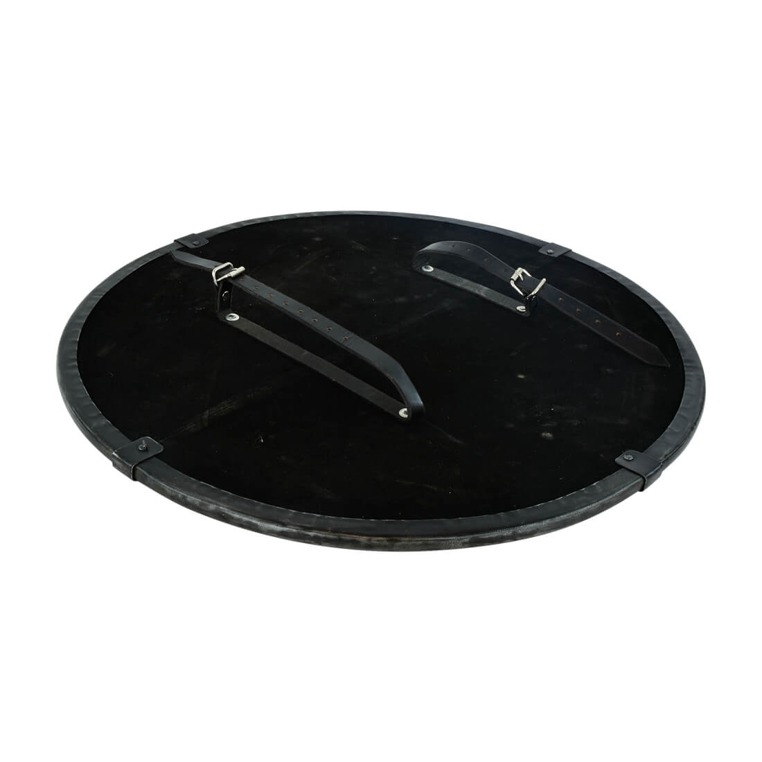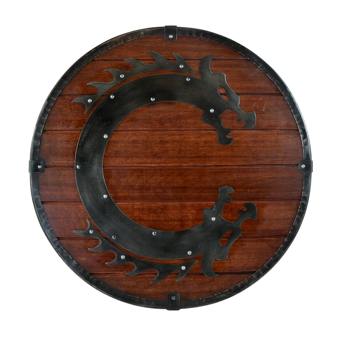 This sturdy Viking shield is constructed from wooden planks with a darkened steel rim – twin serpents of steel are stoutly riveted onto the shield face. The back of the shield is covered in suede leather and it has two adjustable leather straps for the forearm and palm grip.