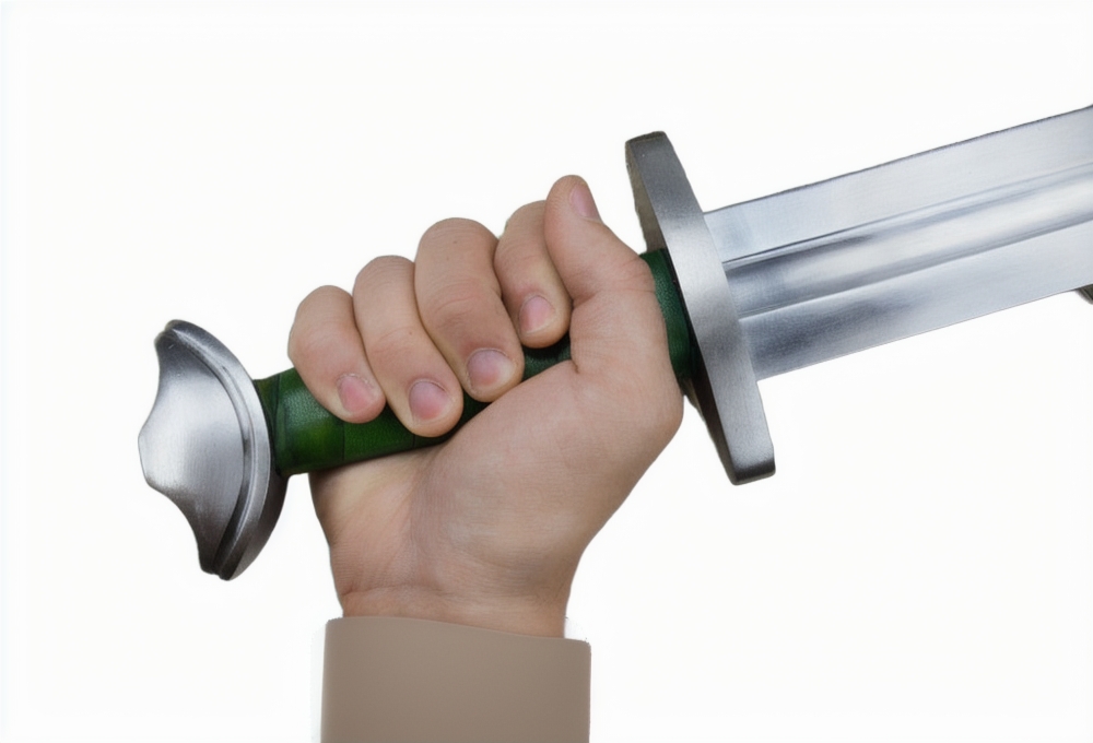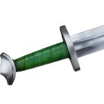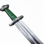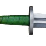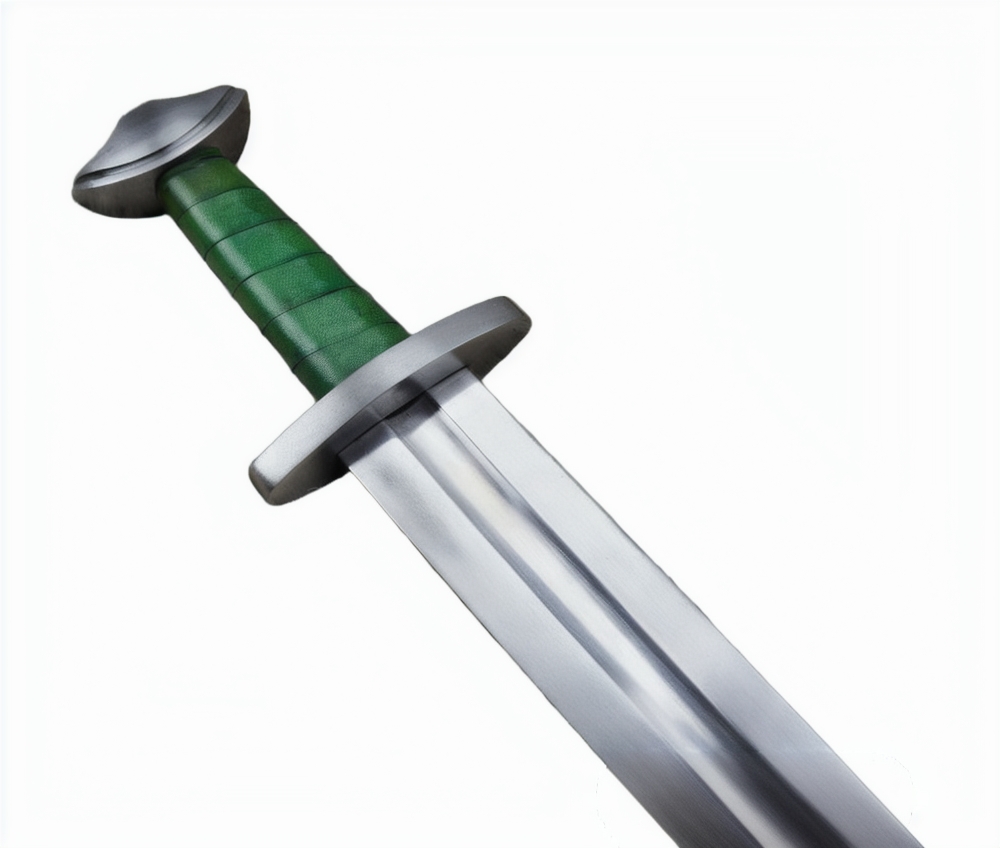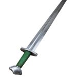 The Viking Temple Sword hails from the weapons of the Viking era. This Viking Sword is built for stage and sport combat; it has a thick edged blade with a rounded tip and a robust peen over the pommel. The blade is high carbon steel, the guard and pommel are steel and the wooden grip is bound in green leather. Included with the sword is a wood-core scabbard with a green leather wrap, steel chape, and a wooden suspension loop for wear.