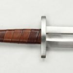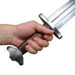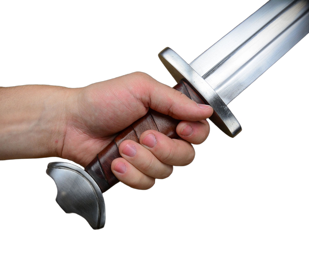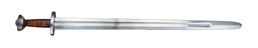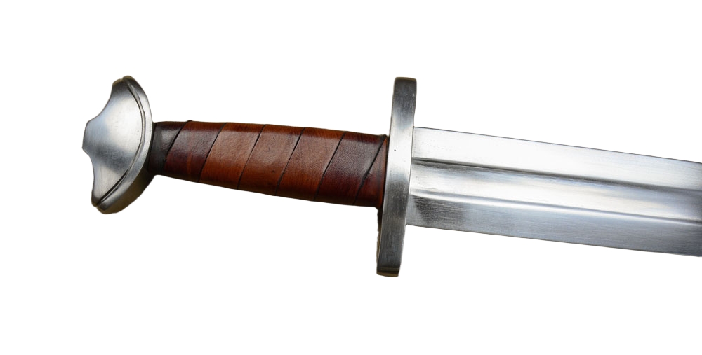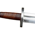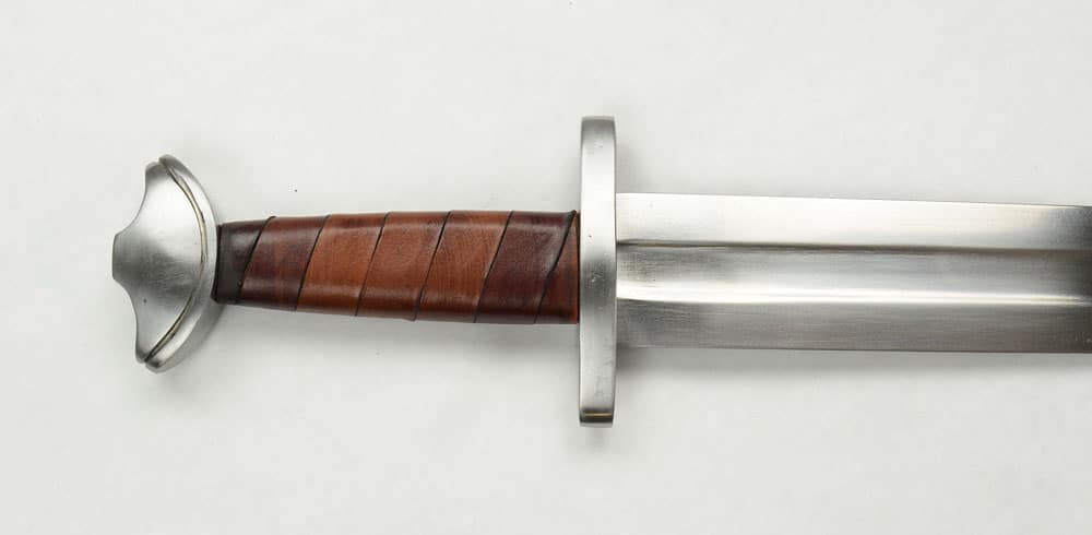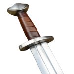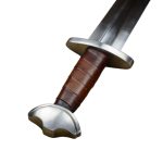The stage and sport combat version of the Viking Temple Sword has a thick, blunted blade forged from EN45 high carbon steel. The crossguard and pommel are forged from mild steel and the wooden grip is wrapped in brown leather. The sword is paired with a wooden scabbard overlaid in green-dyed leather. It has a stained green wooden suspension loop and a steel chape.