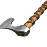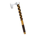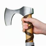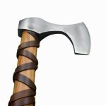 This Viking axe has a head which is crafted from high carbon steel which is mounted onto a stout haft which is carved from robust hardwood. The axe is firmly seated and mounted directly onto the haft with a substantial rivet and it is then further reinforced with a steel axe wedge which is driven into the axe head socket to expand the wood for a very tight and permanent mounting.