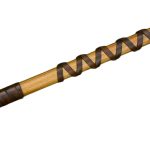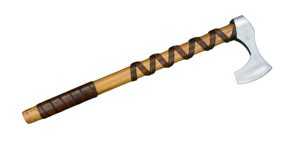 Knotted and riveted bands of thick and high quality vegetable-tanned leather and a spiralled leather grip complete the axe.